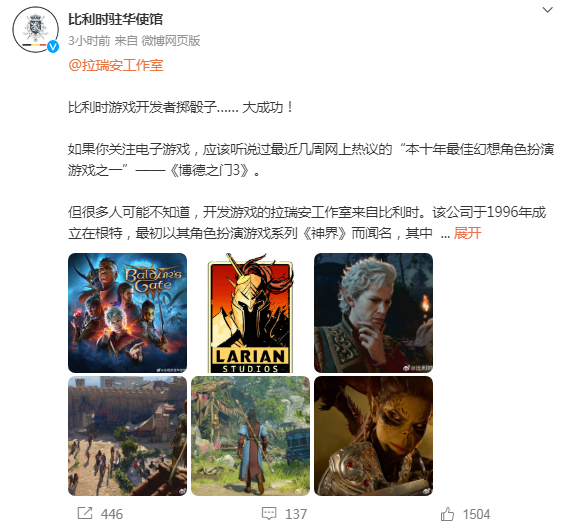 发布于8月6日的奇幻风格CRPG游戏《博德之门3》,在上线后的第二周继续保持着Steam销冠的地位。这个测试阶段便吸引了13856 同时在线的游戏,正式登陆Steam后玩家峰值飙升到了87万,97的评分更是达到了年度最高这个层级。 根据官方宣布的数据,《博德之门3》已经卖出了520万份,远远超出了主创们的预期。 而在今日,又一则关于《博德之门3》的消息引起了玩家们的注意。比利时驻华使馆的官方账号,于今天下午在微博发布了动态,以求向更多人安利这款由拉瑞安工作室开发的作品。在这条动态中,比利时驻华使馆介绍了游戏的背景、玩法,以及发布以来取得的成绩。 虽然拉瑞安工作室影响力最强的几款游戏《神界》系列和《博德之门3》,都是近十年的作品,但这个工作室的历史比大部分玩家想象中要更久远一些。正如文中所说的那样,很多人可能都不知道拉瑞安工作室来自比利时。 《博德之门3》作为一款现象级的爆款作品,比利时驻华使馆发布动态支持本国新产业的发展,完全可以理解。几年前热度超高的《赛博朋克2077》,在开发过程中就一直享受着波兰政府的扶持,CDPR从中获得了不少开发预算。 当然,对外宣传一款游戏,《原神》也有过《博德之门3》同款待遇。 《博德之门3》的成功绝非偶然,早在开始阶段拉瑞安工作室就在赌。他们不仅投入了超高的预算成本,还为了保证游戏规格提升了工作室的规模。如果发布后效果不佳,那么大家看到的可能就不是在高强度网上冲浪的创始人Swen Vincke,而是寻求收购的Swen Vincke了。 好在这场豪赌拉瑞安工作室赌对了,不仅收获了好口碑,同时也凭借极佳的销售数据大赚一笔。《博德之门3》不论是销量、口碑还是在线玩家人数,都达到了拉瑞安工作室历史上从未有其他游戏能企及的高度。 这次的成功,让拉瑞安工作室对高投入、高回报有了更为清楚的认知,Swen Vincke也保证今后会给玩家们带来更多品质如《博德之门3》一样的游戏。 不过在那之前,《博德之门3》的更新工作以及次世代主机版本还得继续上。正如测试阶段一直在积极采纳玩家意见一样,将于9月发布的《博德之门3》PS5版本新增了日语版本,这也算是给了一直在吐槽游戏没本地化处理的日本玩家一个交代了。 那么大家觉得,《博德之门3》接下来有望竞争年度最佳游戏吗? |