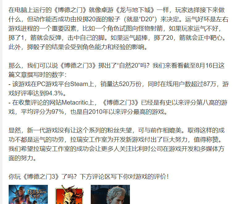 我们都知道《博德之门3》Steam发售以来销量非常好,毕竟这款3A cRPG Steam同时在线峰值超过了87.5万,几乎赶上今年的另外一个大作《霍格沃茨之遗》,后者在线峰值为87.9万。而本周早些时候,NPD分析师Mat Piscatella分享了一些惊人数据:《博德之门3》玩家每天登陆游戏平均游玩时长超过了5个小时。 那么《博德之门3》具体销量又如何?根据比利时驻华使馆微博消息,《博德之门3》仅是Steam平台,销量就超过了520万。《博德之门3》还登陆了GOG,只不过CDPR的数字商店远不及Steam那么大众化,因此GOG上的销量可能比较少一点。 在8月3日正式发售前,拉瑞安工作室CEO Swen Vincke确认《博德之门3》抢先体验版销量超过了250万套。因此我们可以推算《博德之门3》正式发售后的两个星期销量大约在270万套。 微博截图,时间8月17日 对cRPG来说,这是史无前例的成功,而这种类型的游戏不久前还基本上从主流市场上消失了。只有Kickstarter 和其他众筹平台的出现,才使得Harebrained的《暗影狂奔:归来》、《龙陨》,拉瑞安《神界:原罪1、2》,inXile的《废土2、3》,黑曜石的《永恒之柱1、2》以及Owlcat的《开拓者:拥王者》和《开拓者:正义之怒》等游戏出现。 虽然这些游戏中的大多数都在各自的领域取得了成功,但拉瑞安凭借《神界:原罪2》巩固了自己在这一类型游戏中的顶尖地位,从而赢得了Wizard of the Coast的信任,制作了期待已久的《博德之门》系列第三部。 |