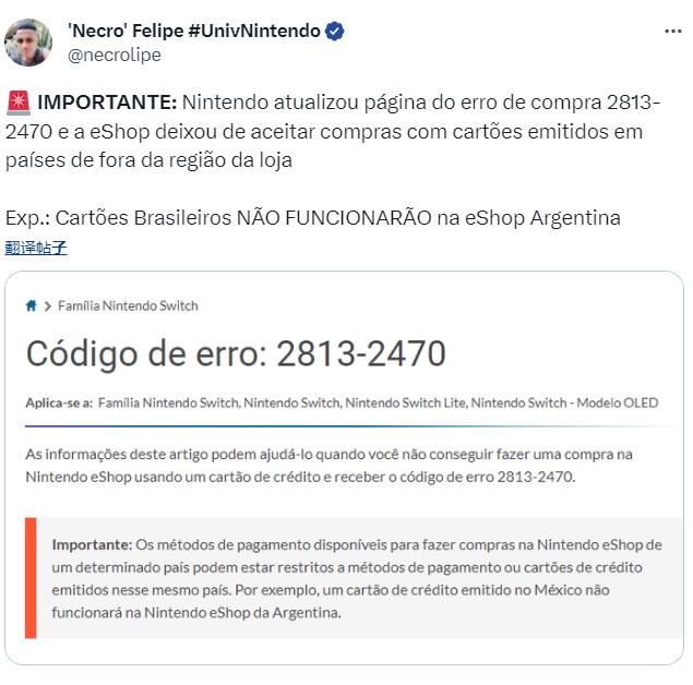 近日,根据外媒Universo Nintendo的主编Felipe Lima的发现,任天堂更新了它的银行卡购买政策,eShop现在停止接受使用商店所在地区以外国家地区发行的银行卡进行购买,例如巴西的银行卡现在无法在阿根廷区的eShop中使用了。