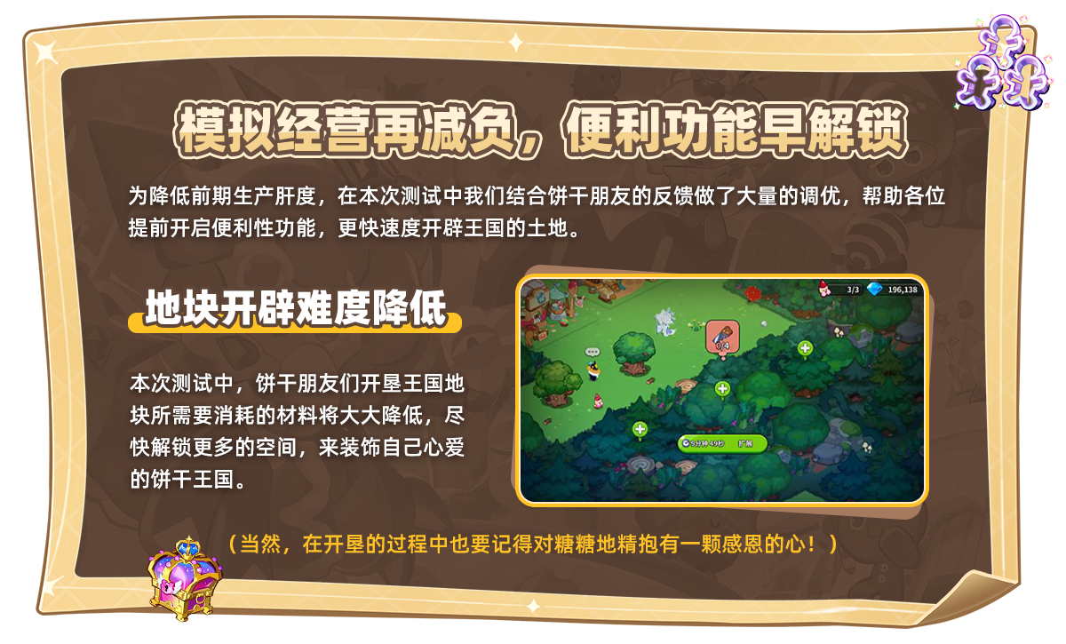 8月23日,《冲呀!饼干人:王国》终于又迎来国服测试啦,本次酥脆奇遇测试有哪些具体内容,饼干王国又带来了怎样的甜品盛宴,让我们一起来细细品味吧! ◆新的冒险正式开始·下一站上古王国 作为一款风靡全球、累计注册超过5000万的融合角色养成冒险和模拟经营的手游。 在《冲呀!饼干人:王国》中,玩家可以培养旅途中结识的饼干人,和他们成为并肩作战的好朋友,一起开启上古王国冒险之旅。除此之外,玩家还可以根据个人喜好,布局搭建属于自己的王国,目前游戏内开放了多种不同风格主题建筑,更有专属角色的互动建筑等待我们去解锁。 ◆资格获取·绝版奖励免费送 本次《冲呀!饼干人:王国》将通过限时抢注的方式发放测试获取,游戏将于8月23日9:00开放下载,10:00开放登录抢注,测试人数达到预期数量后,将关闭游戏下载与注册通道。 另外,只要参与《冲呀!饼干人:王国》酥脆奇遇测试,就可解锁测试绝版福利!所以想要获取绝版奖励的玩家,一定要加快步伐哦~ ◆新增玩法·海风图社来了 在本次酥脆奇遇测试中,饼干王国创新性地添加了“图纸”功能——只要玩家的城堡达到6级,完成修复海风图社的任务后,就可以解锁图纸功能,就可以通过自制或购买的方式获得图纸。 拥有图纸后,玩家可以通过图纸的画面直接购买图纸所需的装饰,并且按照图纸里面的位置摆放,快速实现图纸里描绘的搭建效果。 为方便各位玩家进行创作,图纸功能还开设了创作者模式,玩家可以将自己的布局搭建进行图纸保存上传,经过官方审核后即可将带有自己署名的图纸上架游戏内图纸商店。 海风图社里的图纸会定期刷新,别忘了多来图社看看以免错过任何好看的图纸。 ◆新增角色·上古饼干角色即将登场 在本次酥脆奇遇测试中,还加入了多位全新饼干角色:上古饼干纯香草饼干、超级稀有饼干草莓可丽饼饼干、帕菲饼干、雪酪鲨鱼饼干将一一和玩家见面,丰富玩家的战斗体验。 除此之外,通过游戏内签到活动还可免费获得黑巧克力饼干、拿铁饼干、杏仁果饼干三位超级稀有饼干角色,让玩家们添上强劲战力! ◆?新增外观·国服首曝服装登场 本次酥脆测试增添了多套软萌的服装外观:狂吃果冻装、梦幻派对装、可爱派对装,这些外观只需要达成一定条件就可以免费获得。 而如果你喜欢以夏日游乐园为主题设计的夏日回想主题服装,以及新增三款超稀有服装,莓莓水母装、仙草山猫装、蛙超雨衣装,也可以在商场直接购买。 ◆新增通行证·解锁获得丰厚奖励 本次还新增了“王国通行证”,拥有王国通行证的玩家,就能解锁当季限定地标“软萌果冻小鸭船”等多个稀有奖励! 除此之外,还有“蕴含治愈力量的香草通行证”,拥有香草通行证,即可解锁活动限定地标“春暖花开紫藤桥”和真理之光等丰厚奖励! ◆新增优化效果·游戏内容提升 为了给与玩家更好的游戏体验,官方还在本次酥脆奇遇测试做出了多个优化: 内容方面,游戏添加“王国手札”收集图册,伴随着手札等级不断提升,将会解锁更多道具和外观奖励。 除此之外,为了降低玩家的操作频率,游戏内还进行了模拟经营的前期减负,更多便利的功能将会逐步解锁,将更多重复劳作的时间释放。 获取更多信息、反馈游戏体验优化建议,可关注各媒体官方账号:冲呀饼干人王国,整体来看,本次酥脆奇遇测试福利多多、诚意满满、香气喷喷,赶快下载游戏,一起去感受这次其味无穷的测试吧! |