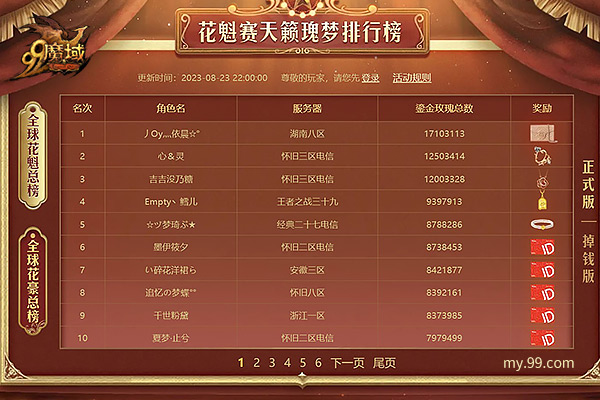 七夕已过,浪漫的氤氲却并未散去,万千光彩与爱意在《魔域》汇成了一朵最闪耀的鎏金玫瑰,宣告着2023年度“鎏金花海”花魁赛的圆满落幕!玩家【丿Oy灬依晨☆°】凭借17103113朵鎏金玫瑰得票荣登全球花魁宝座,而在她身后助力的【丿Oy灬新帅★】则摘下花豪桂冠!这对神仙美眷将携手迈入花魁殿堂,更有Gucci Marmont系列绗缝迷你手袋、花魁花豪量身定制“鎏金华岁·盛世”时装等大礼奉上,伴随他们度过一个难忘的浪漫盛夏! 全球花魁花豪诞生 见证年度爱情佳话 生活中的999朵玫瑰象征着天长地久的爱恋,而在《魔域》“鎏金花海”花魁赛中,女神们接收到的爱意更是足以汇成一片无垠的花海,象征着矢志不渝的万千宠爱!在本届花魁赛中,来自湖南八区服务器的玩家【丿Oy灬依晨☆°】累积收获了超过1710万朵鎏金玫瑰,加冕全球花魁;而这份冠绝全球的宠爱背后,则是同服玩家【丿Oy灬新帅★】的全力付出,他也凭借超1684万朵鎏金玫瑰的赠予量化身全球花豪,与心爱之人共享殊荣! 纵观两人的夺魁之路,也是十分具有策略性的,可谓黑马逆袭:赛事首周的排行榜上,前十之中还尚未有【丿Oy灬依晨☆°】的一席之地;而从次周开始,【丿Oy灬新帅★】就犹如要为爱人献上一份七夕大礼般疯狂发力,持续送出超千万朵玫瑰助力心中女神瞩目登顶,也让全球玩家共同见证了这段爱情佳话! 如今赛事尘埃落定,两人也将在花魁殿堂中铸像扬名;身着全球唯一的“鎏金华岁·盛世”花魁、花豪华服,共乘“缰绳·鎏金梦歌”,浪漫同游亚特大陆;更有实物大奖高端大牌GUCCI手袋相赠,装点浪漫人生! 当然,榜单上的其他魔域女神也将获得周生生艾斐诗颂玫瑰钻戒、周大福秘密花园玫瑰红宝石钻石项链、周六福玫瑰镶钻石黄金吊坠、潮宏基玫瑰黄金珍珠手链等奢华臻礼,闪耀这个夏天! 花魁赛事蒸蒸日上 达人频出共襄盛举 自2013年首届花魁赛开赛至今,已经慢慢成为了玩家们不可或缺的年度盛会,《魔域》不仅通过不同的赛事主题多元诠释女性玩家的美好特质,同时也依托各种赛事配套活动为玩家们带来更好的赛事体验: 本届赛事“鎏金华岁·盛世”等主题装扮优雅奢华,用天籁鎏金刻画了高品质的生活追求,在玩家群体中掀起了一股复古热;各类实物大奖、互动奖励不断升级,也让花魁赛成为了一场不容错过的全民狂欢;而决胜夜官方直播揭晓花魁花豪,则为玩家提供了直播间实时互动、见证美好时刻的欢聚良机;外加魔域达人秀平台中各路参赛女神、实力路人秀出风采,已然开启游戏社交全新模式,人人皆是赛事明星! 鎏金花海盛放,赛事完美收官!今夏的美好与您送出的那支鎏金玫瑰息息相关,也愿来年花魁赛事再聚,一同成就别样精彩! |