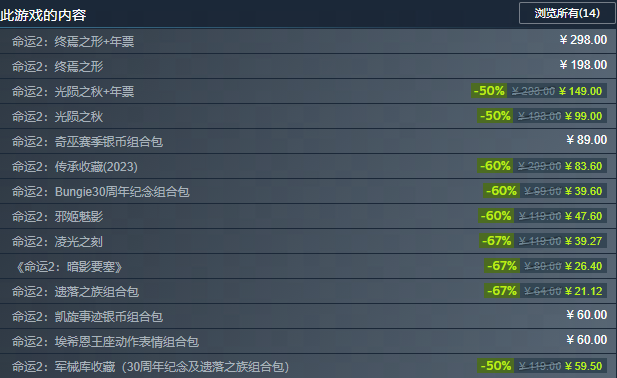 此外,即日起至9月6日,《命运2》系列推出了最高直降67%的限时优惠活动。《光陨之秋》原价¥198,现在平史低5折仅需¥99;《邪姬魅影》原价¥119,现在平史低4折仅需¥47;《凌光之刻》和《暗影要塞》推出了降67%的折扣力度。