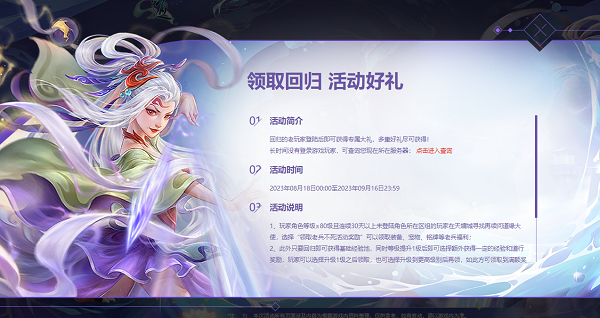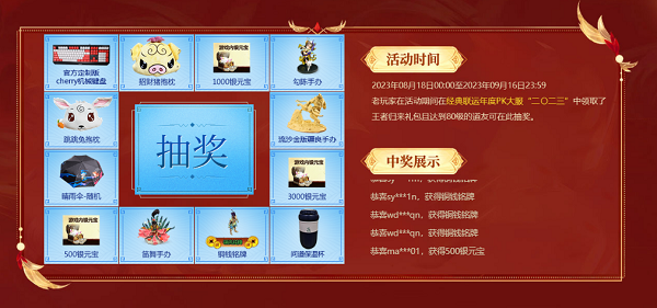 《问道》经典联运年度PK大服“二〇二三”开启,多重新服专属福利活动正在进行中!现“老兵回归”活动同步进行中,丰厚的回归奖励和专属特权等道友前来领取,期待道友重返中洲大陆,续写王者辉煌! “老兵回归”活动时间截止至9月16日,回归的老玩家登陆后即可获得专属大礼,海量经验、特权豪礼等福利尽可获得!角色等级≥80级且连续30天以上未登陆角色所在区组的玩家,在天墉城寻找“再续问道缘大使”可以领取装备、宠物、铭牌等老兵福利。此外只要回归即可获得基础经验池,同时等级提升1级后即可选择额外获得一定的经验和道行奖励,玩家可以选择升级1级之后领取,也可选择升级到更高级别后再领,如此方可领取到满额奖励。(回归玩家若等级低于100级,则不可获得:装备、宠物)。 王者回归,浴火重生,登录就有好礼送!王者礼包限时领取,等级≥80级且连续30天以上未登陆角色所在区组,可以前往原区组“问道缘大使”处领取激活码,在新服“二〇二三”的“问道缘大使”处使用此激活码进行兑换。王者归来礼包内包含丰厚豪礼,金色称号:长生久视、道心永驻,人物铭牌、随机时装等,更有天空石、天星石等道具奖励,人物等级到80、90、100、110、120、130均有对应奖品可拿! 在老兵回归活动期间开启的新服领取了浴火重生之王者归来礼包,且在新服“二〇二三”角色等级≥80级后,可以前往官网专属老兵活动中进行抽奖。有机会获得官方定制Cherry机械键盘、流沙金版疆良手办、勾陈/笛舞手办、跳跳兔抱枕、问道晴雨伞等官方周边、游戏内铜钱铭牌等奖励。 经典联运年度PK大服“二〇二三”开启,中洲论道等道友再创传奇!新服更有超多专属福利回馈活动新服累计充值抽奖、新服首充礼包等进行中,道友别错过! |