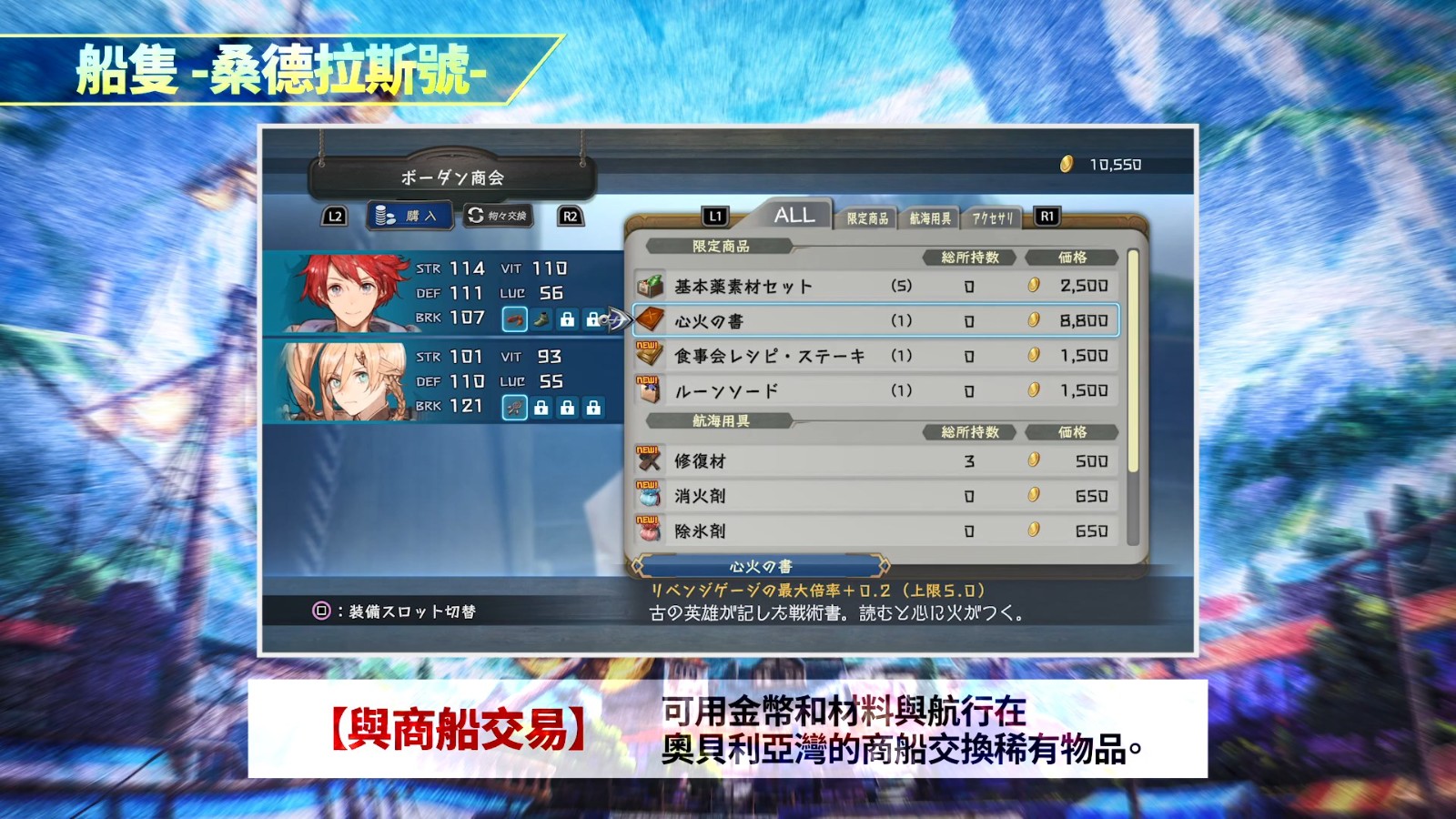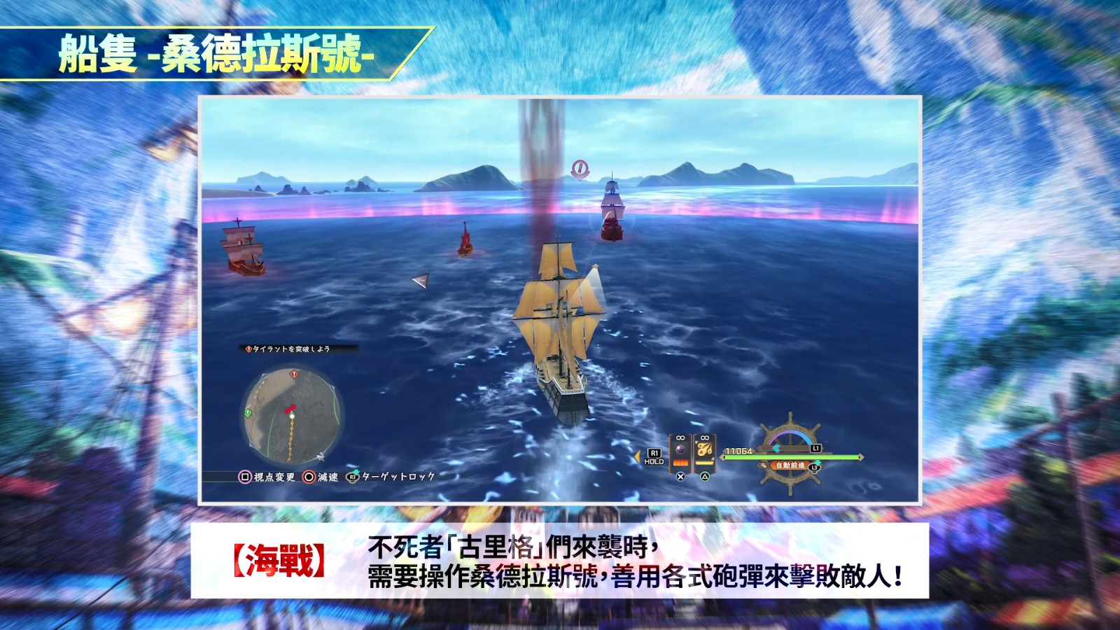 本次的冒险好朋友之一「桑德拉斯号」,当不死者「古里格」来袭的时候,玩家需要操作桑德拉斯号迎战,登上敌船甲板,触发战斗,赢得胜利,并且宝箱中夺得稀有道具。使用金币和材料与航行在奥贝利亚湾的商船交易,换取稀有物品。