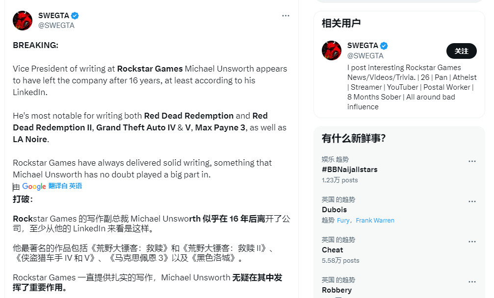 R星16年资深编剧现已离开了工作室