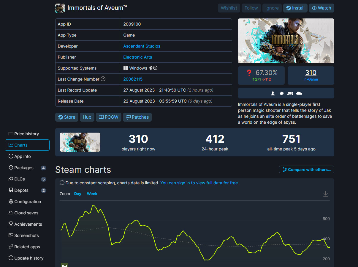 8月22日发售的魔法FPS游戏《不朽者传奇》销量不太乐观。根据SteamDB,该作在Steam上的在线峰值仅751人,甚至没有超过1000。游戏评论仅323篇,当前评价为“褒贬不一”。 《不朽者传奇》Steam定价国区248元,其他区定价也比较偏高:60美元/60欧元/50英镑/8700日元,基本上是按照全价3A游戏定价。 《不朽者传奇》虽然开发了5年之久,但毕竟是一个EA Original游戏,充其量应该是一个2A游戏,和之前光荣的《狂野之心》差不多,但后者的定价也偏高,售价298元。 除了价格因素,《不朽者传奇》的优化也吓跑了不少PC玩家。况且近期还发售了FromSoftware的大作《装甲核心6》,即将发售的还有《星空》,种种因素让《不朽者传奇》翻车。虽然该作同时登陆了主机平台,但同样没有引起太大的反响。 |