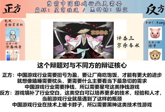 由华语辩论网举办的华语网辩超级冠军杯公布了决赛赛果,本次决赛的辩题是:当前中国游戏行业更需要《崩坏:星穹铁道》/《黑神话:悟空》,对阵双方: A1 光风爱输霁月机VS F2 RUC-Bang,最终《黑神话:悟空》4:1击败《崩坏:星穹铁道》获得胜利。