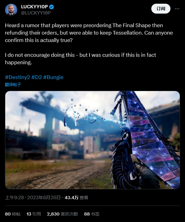 目前有一些《命运2》玩家正在预购游戏的下一个资料片“终焉之形”以及年票,等领取到预购奖励的限定异域武器以后,再取消预购。据称他们能够继续保留这把武器。 《命运2》内容创作者 Luckyy10P 最近在推特(X)上询问了玩家能够保留预购奖励的传闻是否属实,许多玩家都证实了传闻。 Luckyy 补充道:“我不鼓励这么做,但是我很好奇是否确有其事。” 目前尚不清楚是否所有平台玩家都能够通过这种方式获取免费的异域武器。目前大多数玩家都逃脱了 Bungie 的惩戒,并获取的免费的武器。而且许多人表示很惊讶,因为之前在“光陨之秋”时玩家们就已经这么做过,而该漏洞依然没有修复。 根据一位玩家表示,根据上一次的经验,免费异域将可以使用至扩展正式推出。 而且有趣的是,Xbox 玩家甚至无需在“终焉之形”于明年 2 月发布前支付费用,这也意味着一些玩家完全没花一分钱就免费获得了异域武器。 以为不满的玩家表示:“获得这把武器绝对是 P2W。在 DLC 发布之前,它根本不应该可以拿到。” 《命运2》“终焉之形”扩展将于 2024 年 2 月 28 日发售。 |