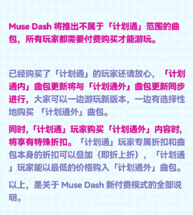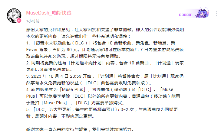 游戏中的内购、微交易要素如今已经非常常见了,而不同的游戏之间的氪金内容也各不相同。在竞技类游戏中,内购通常是通行证、皮肤饰品;而在音游中则会是歌曲曲库。 近期二次元音游《Muse Dash》官宣了跟初音未来的联动,对于这位人气超高的虚拟形象,玩家们怀有很高的期待。可在公布这起联动活动的同时,官方也带来了一则新公告。其中所涉及的有关游戏中的一大氪金要素的变化,引发了玩家们的强烈抵制情绪。 《Muse Dash》是一款付费音游,每逢曲库进行更新时,玩家都需要额外购买。不过官方后来上线了一个名为【计划通】的项目,只要购买它就等于解锁了所有的付费内容,同时今后的更新也将全部免费。 虽然【计划通】本身的价格比游戏本体的售价都要高出许多,中途还涨过价,但为了能够一劳永逸,大部分玩家都选择了购买。毕竟“永久免费”这几个字太有吸引力了,《Muse Dash》也因为这个良心的付费项目获得了口碑上的提升。 然而在这次的联动活动中,官方却为玩家们带来了新的付费模式说明。其中明确提到:“《Muse Dash》将推出不属于【计划通】范围的曲包,所有玩家都需要付费购买才能游玩。” 这项更新说明直接触动了玩家们的神经,因为这代表着原先的曲库“永久免费”出现了例外的情况。Steam等各个平台,都迅速出现了大量玩家差评。一些在趁着夏促打折才入手【计划通】的玩家,更是觉得自己遇上“电子仙人跳”了。 ——官方先抛出一个足够有诱惑力的项目吸引人入局,结果“惊喜”却在后面。 好在随着事件的发酵、玩家的抵制情绪愈发高涨,官方率先顶不住松口了,发布了新的公告进行处理。 一方面官方为【计划通】补充了10首新曲,平复已经购买过该项目玩家的情绪。另一方面,则将本次的联动内容独立出来,当成一个新的DLC而非常规的更新内容。拥有【计划通】的玩家,可以在首周免费领取,但超过期限后就需额外购买了 这算是一个折中的方法,但确实有效。至少持有【计划通】的玩家,确实能继续享受福利。至于其他玩家也能自由选择,在必要的时候入手自己喜欢的曲目。 当然,这件事对【计划通】本身的销量影响还是切实存在的。因为经过此次的事情,玩家难免会担心“永久免费”的规则在未来会不会再度被打破。事已至此,只希望《Muse Dash》官方和业界同行们都能从这个案例中吸取教训,避免同类型事情再度发生吧。 那么大家对此又有什么想说的呢? |