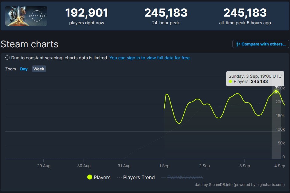 《星空》高级版玩家已抢先体验一段时间了,虽然许多人认为加载界面多、小Bug多影响了他们体验。但据Steamdb数据显示,本周末《星空》同时在线玩家数量一直维持在20万上下,留存率依然很高。 9月1日,《星空》玩家在线人数峰值已达234502人,该记录在昨晚7点被刷新至245183人,截至发稿时在线人数为192901人。《星空》于9月6日正式发布后,玩家在线人数峰值或将继续上升。 《星空》标准版将于9月6日(国内早上8点)解锁,高级版和收藏版已于9月1日开启抢先体验。本作拥有引人入胜的画面,有1000多个星球可供探索。游戏开放性和自由度很高,没有固定的剧情和结局,玩家可以自由塑造属于自己的故事。 |
