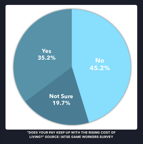 一项新的工会调查获得的结果进一步引发了人们对游戏开发中的加班文化的担忧,超过一般的开发者曾在过去两年内经历过加班赶工。 根据 IGN 报道,被称为国际戏剧舞台工人联盟(IATSE,目前正代表漫威视觉特效员工争取成立工会的团体)的娱乐行业工会在 2023 年 3 月至 8 月中旬期间收集了数百名 3A、移动和独立开发商的数据。 57% 的受访者表示他们最近参与了一款 3A 游戏的开发。参与开发者平均行业经验为 6.9 年,不到一半的受访者在游戏行业工作了 7 年以上。 IATSE 的调查显示,大多数受访者表示他们平均每周工作 40 小时,但 1/4 的受访者表示他们工作了 41 小时或以上。据称最长的平均工作时间为每周 95 小时(如果一周 7 天无休则平均每天依然为 15 小时)。 超过一半(58%)的受访者表示他们的工资为年薪,而 26.4% 的受访者为时薪。许多受薪开发者报告了关于加班费的问题,其中一些人表示加班费是“豁免”的。一位开发者表示:“令人沮丧的是根据加利福尼亚州加班法,我每天工作 14 小时应该获得 18 小时的工资,而我只拿到 8 小时的工资。” 在接受调查的人中,54.3% 的人表示他们未能协商加薪。将近一半的受访者(45.2%)表示,他们的薪酬与生活成本收支不平衡,近 20% 的受访者则不确定。 退休保障也是一个重大问题。超过 36% 的开发者表示他们没有雇主资助的退休计划。 当被问及是否相信自己的职业生涯可持续时,42.9% 的员工给出了肯定的回答,37.9% 的开发者认为它“不可持续”,19.2% 的人不确定。 IATSE 的调查还涵盖了行业经验、自由职业薪酬、是否需要做职位描述之外的任务、远程工作、医疗保健等数据。 IATSE 计划与受访者举行一次围绕“游戏行业工会化展开讨论”的线下大会,以确定下一步行动。 去年,UNI Global 工会的一份报告发现,79% 的游戏行业员工支持成立工会。 |