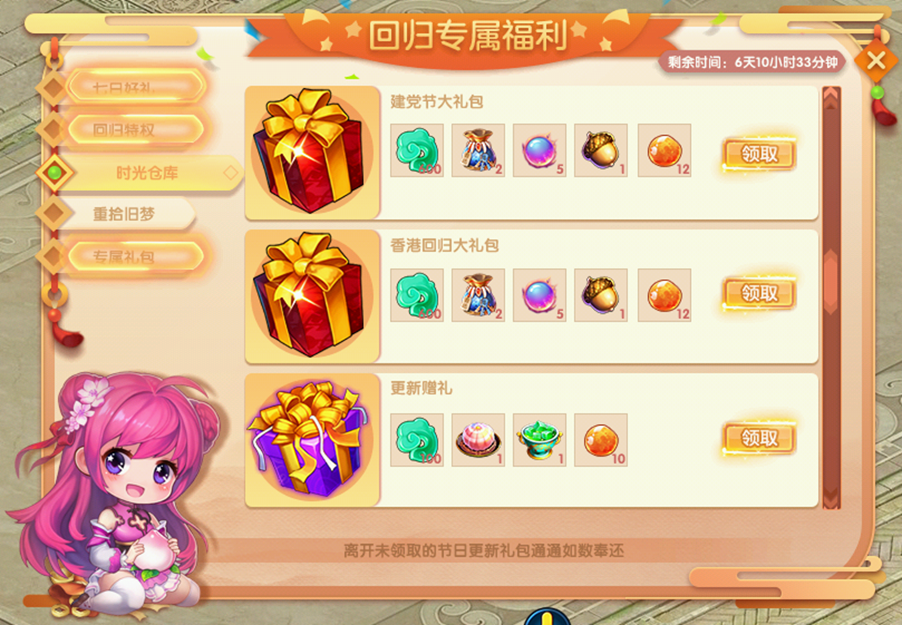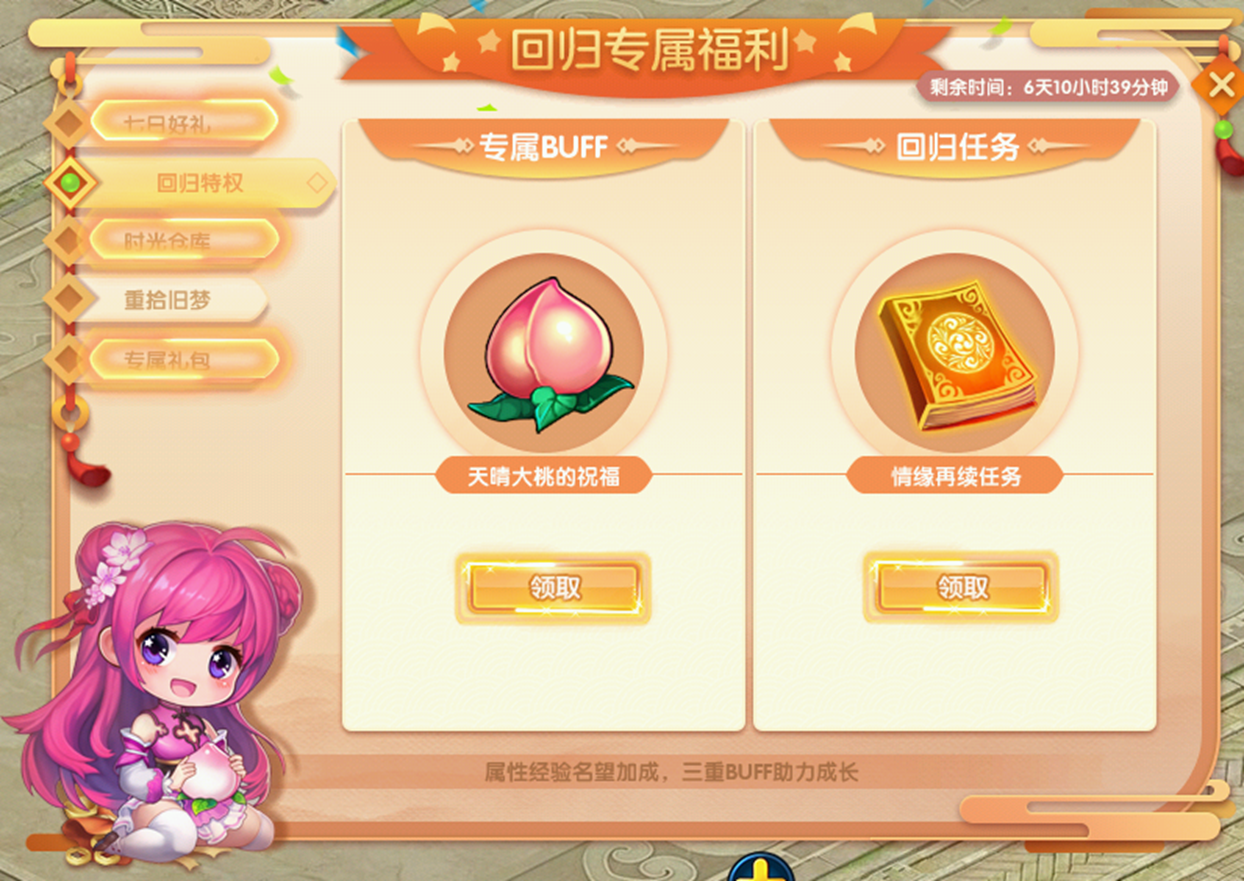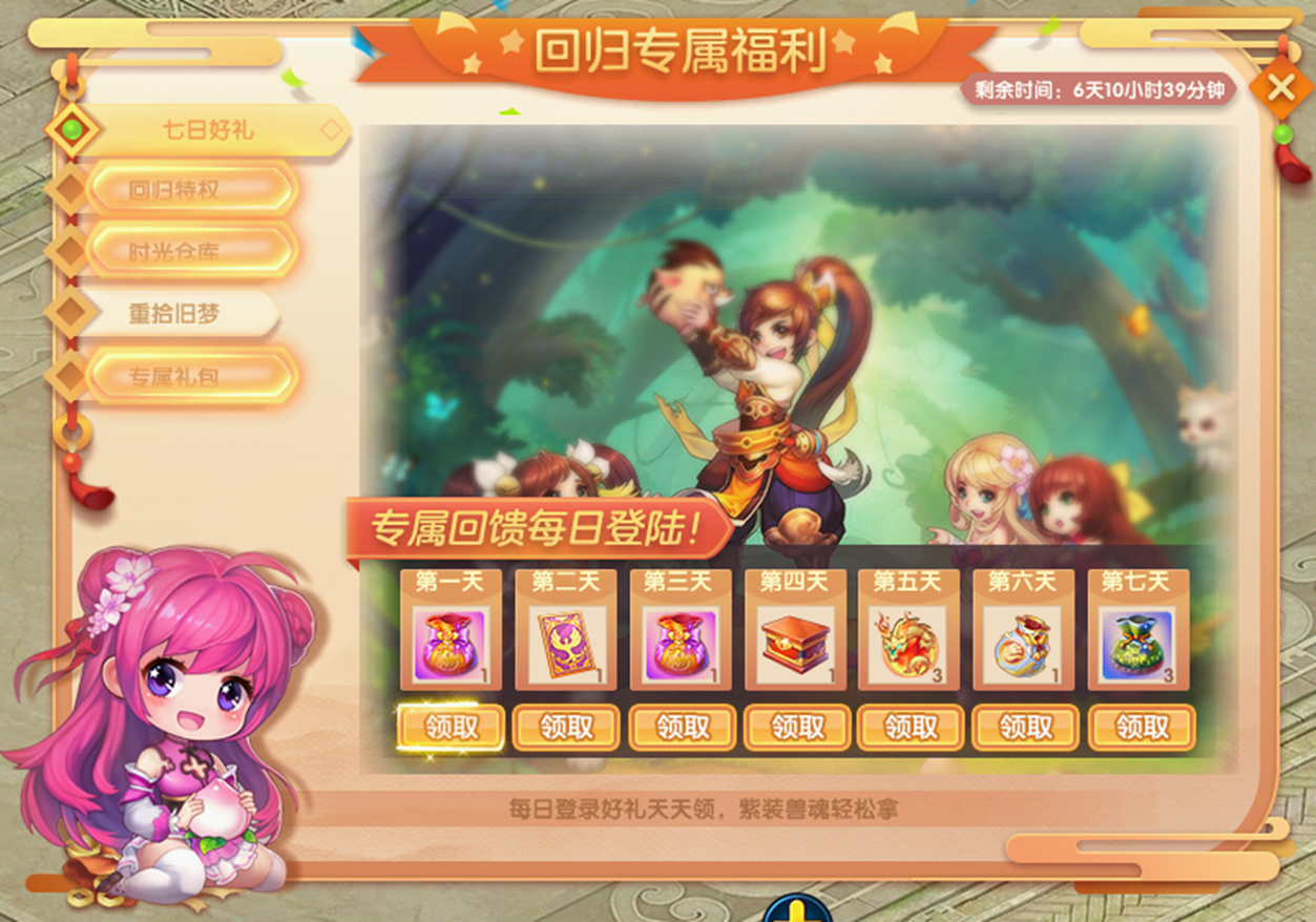 回首七载桃花岁月,桃花好友共同经历过欢笑与泪水,共同拥有过激情与梦想。每当想起这片江湖,感觉到的是久违的温暖!《桃花源记2》在七周年之际,为阔别已久的老朋友们带来诸多的回归福利!特供BUFF、专属礼包、七日好礼、时光仓库等等。嘿少侠,与其宅于居内,不妨回来一同结伴畅游桃花源,找回最初的感动! 好友组队,福利加倍 活动时间 2023年9月6日-10月6日 活动内容 任意玩家可创建队伍成为队长,最多邀请2位好友参与组队活动,邀请的好友需要在页面绑定游戏区服和游戏ID,绑定后即视为组队成功。 队伍满2或3人皆可领取礼包;队伍满员后,队长还能获得额外的专属礼包。每人仅可参与1次组队(不论作为队员还是队长)。 活动规则 本次活动奖励均发放到此绑定的角色里,帐号一经绑定后不可修改,请仔细确认后再绑定帐号角色。 活动最终解释权归游戏官方所有。 回归老服,重温快乐 活动时间 2023年09月08日12点-2023年09月14日24点 活动内容 相关NPC 洛阳(221,133)“老友接待使”。召回好友获得老友积分,好友回归后,每天活跃度达到100或充值都可为自己增加老友积分,积分物品用来抽取奖励!珍稀灵兽任选包、精灵之魂任选包、星图碎片任选包等超多丰厚大奖等你来拿! 活动规则 符合老友账号条件即可参与:必须是在2023年09月01日-2023年09月08日7点之间一直未登陆的账号,账号下任意一个角色都可以进行回归验证。 老友回归,共话当年 活动1:验证后马上获得老友专属BUFF和礼包,队友也能获得BUFF加成哟; 活动2:七日好礼,每天登录就送; 活动3:时光仓库,帮你保存你离开未领的礼包; 活动4:重拾旧梦,每天上线完成小目标就能拿到奖励; 活动5:专属礼包,经验帮贡每天免费领,还有超低折扣道具包、福袋限时出售; 回归新服,再启新程 活动时间 2023年09月08日12点—2023年09月14日24点 回归新服 活动1:验证后马上获得专属回归称号和礼包; 活动2:根据老角色的等级和充值返利超高金票,最高可达10W! 还等什么,叫上曾经的桃花老友共同战斗,一起找回组队的快乐,就是现在! |