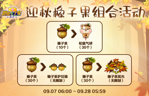 秋意渐浓,在本次更新后,《跑跑卡丁车》秋日神秘商店限时开启营业!同时,游戏内还将限时开放<迎秋橡子果组合活动>,“橡子果炫光(无限制)”、“橡子果护目镜(无限制)”等多重好礼,静待车手们赢取!此外,新道具赛道——[龙行华夏 奥林匹克公园]即日开放! 同时,2023KCL将在今日(9月7日)19:00正式开赛!记得准时前往《跑跑卡丁车》斗鱼官方直播间(房间号:7722576)观赛哦~ 【神秘商店限时开业 跑跑通行证支援任务来袭】 9月7日06:00至9月21日05:59期间,秋日神秘商店来袭!包含“稀有部件 V1(无限制)”、“迷你黑鸟(无限制)”、“自由宝宝(无限制)”、“虎啸朱黄色喷漆(无限制)”等道具在内的丰富好礼,尽在神秘商店内等待车手们赢取! 9月7日06:00至9月14日05:59期间,车手们每日可通过完成游戏内多人游戏行驶5回,来赢取通行证升级券10个哦~“红莲 V1(无限制)”、“龟龟车 V1(无限制)”正在向车手们招手,切勿错过哦~ 【橡子果组合活动开启 新道具赛道即日开放】 一起像松鼠一样来收集橡子果吧!在9月7日06:00至9月28日05:59活动期间,游戏内将限时开放<迎秋橡子果组合活动>!车手们集齐不同数量的橡子果并组合后,将可以获得“松鼠气球(30个)”、“橡子果护目镜(无限制)”、“橡子果炫光(无限制)”等不同道具! 此外,在9月14日06:00至9月28日05:59期间内组合橡子果,还能赢取“迷你松鼠(无限制)”、“V1特殊部件箱(1个)”哦! 同时,在本次更新后,新道具赛道——[龙行华夏 奥林匹克公园]将正式开放!在9月7日06:00至9月21日05:59期间内,游戏内 [龙行华夏 奥林匹克公园]的赛道对决限时开启!每日完成指定任务,将可赢取橡子果哦~ 【2023KCL即日正式开赛】 9月7日 19:00,2023KCL海选赛第一场正式开赛!8支战队首先开战,掀起繁荣山丘第一波竞技热潮,请锁定《跑跑卡丁车》斗鱼官方直播间(房间号:7722576),欣赏各位选手带来的精彩表现! 《跑跑卡丁车》秋日神秘商店持续营业中,2023KCL激烈开赛,请即刻前往繁荣山丘感受不一样的秋日漂移之旅! |