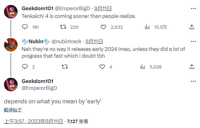 根据知名龙珠爆料人Geekdom101最近分享的消息,《龙珠Z:电光火石4》可能会在2024年初发售,但是具体信息和消息来源,Geekdom101没有透露,不过可以他可以明确的是《龙珠Z:电光火石4》不会在2023年推出。