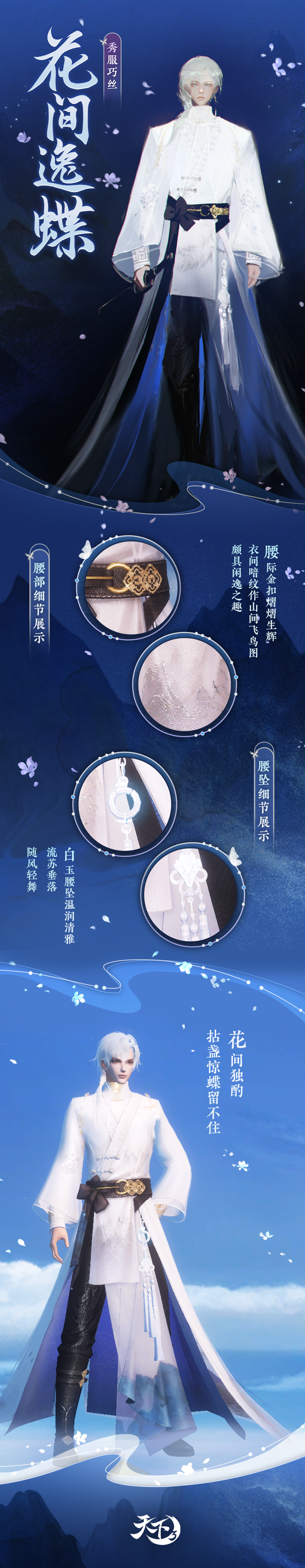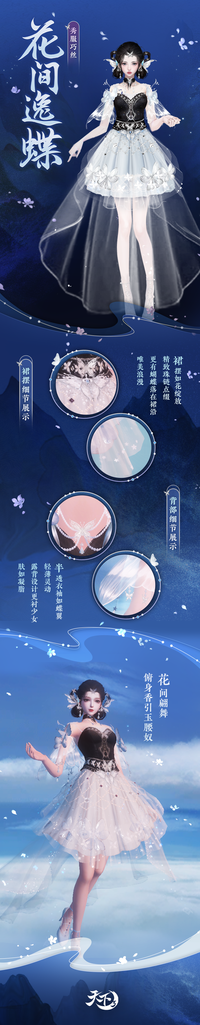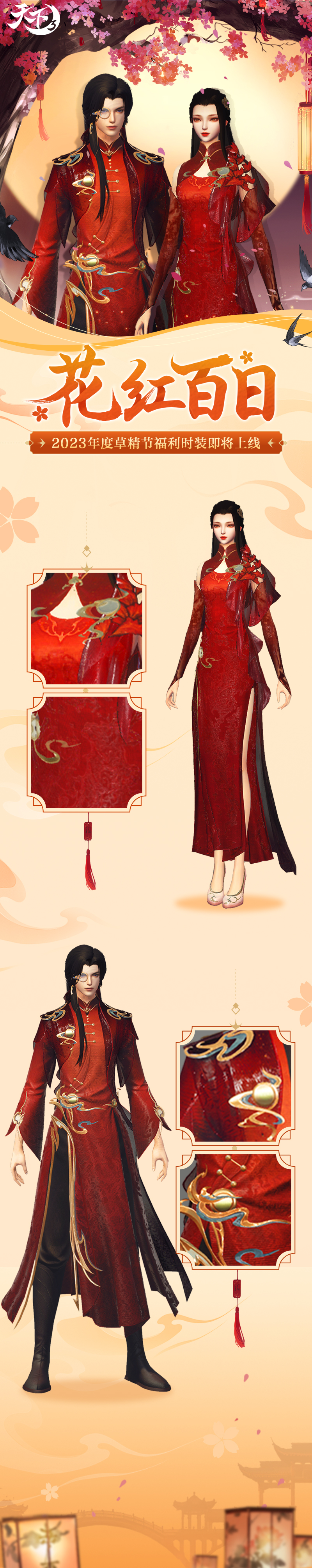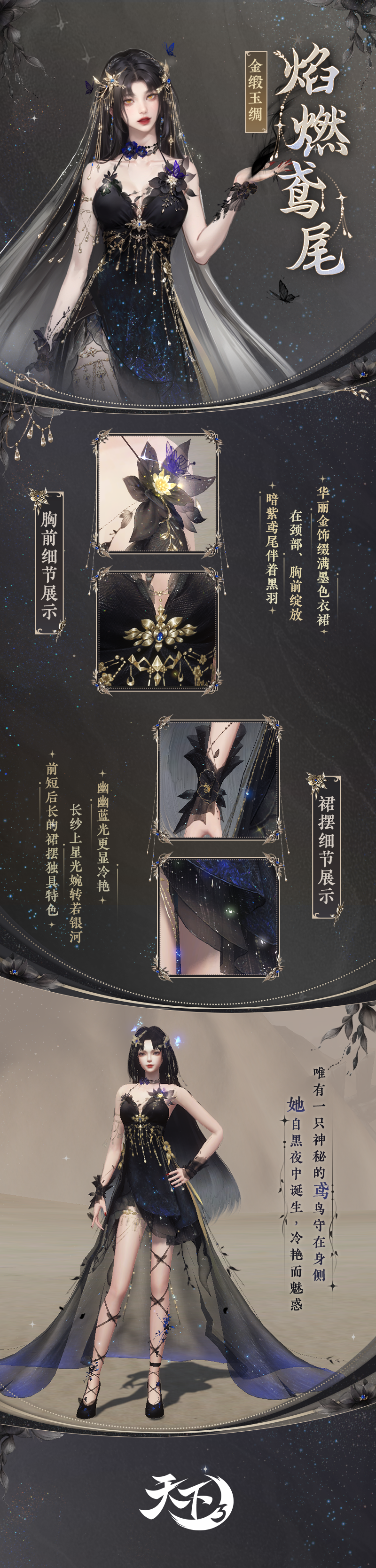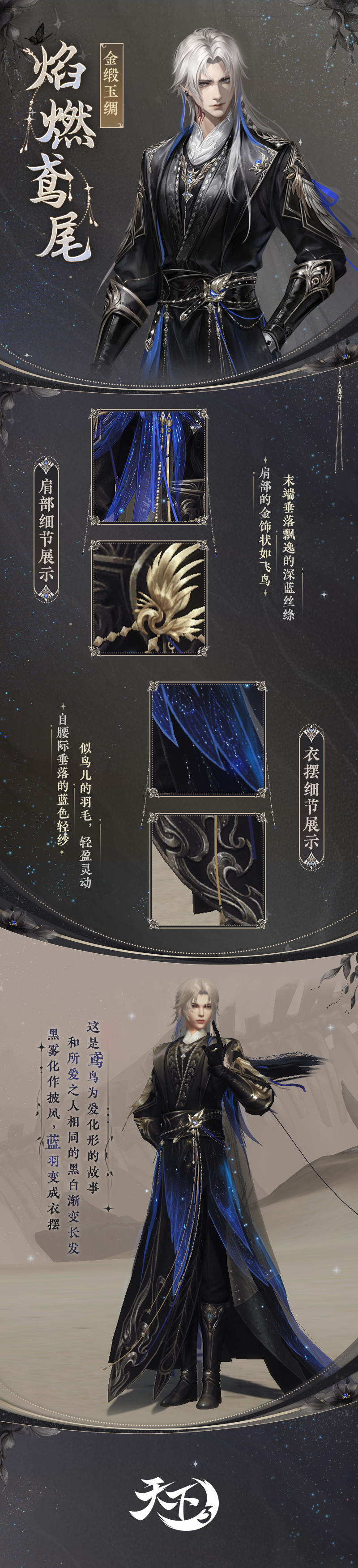 神鸟振翅高飞,翱翔璀璨天际。全新【玉骨魂】系列惊鸿羽翼即将降临大荒,为少侠带来摄人心魂的神鸟之姿。还有【焰燃鸢尾】与【花间逸蝶】同步上线,为少侠演绎鸢尾化形、花间蹁跹的山海浪漫。更有全新时装【花红百日】供少侠免费获取! 以上外观即将于9月20日《天下3》版本更新后正式上线,先来一睹为快吧~ 玉骨魂惊鸿羽翼,尽展摄人心魂之美 山海之间,神鸟振翅而来,应是哪般震撼的景象? 身披坚甲,却又覆着最为柔软的羽毛,这般矛盾又和谐的画面,应当如何呈现? 为了为少侠们带来最为摄人心魂的神鸟之姿,《天下3》首次在羽翼设计中融入了错金工艺,将羽毛与镂空金属完美结合,使其呈现出刚柔并济之美。 【玉骨魂·帝紫】取色于浩瀚星空,暗黑夜幕中繁星熠熠生辉。神秘中多了几分梦幻与唯美,羽翼微颤,似银河落人间。 【玉骨魂·蚀金】披覆耀眼的金光,正取材自那光芒万丈的太阳。扇动时,光尘、金羽洒落,贵气辉煌,令人不敢直视! 【玉骨魂·烈赤】正如那翻腾着的烈焰熔岩,黑色羽翼却有如火焰一般势不可当。肆意燎烧着周遭的一切,此翼一扇,气场全开! 为爱化形,焰燃鸢尾倾诉曼妙风情 关于【焰燃鸢尾】时装,还有这样一段典故—— 北溟中最为寒凉的深渊之中,万籁俱寂之处,这里的长夜似乎没有尽头,天地间唯一的亮色,仅有一朵散发着幽光的墨色鸢尾花。 不知年月,一只蓝色鸢鸟误入此间。他见过万魔墟的滚滚沙尘、见过极乐谷的醉生梦死、甚至越过天堑看过中原的磅礴,却没有见过这般最为纯粹的黑暗,更没有见过在这般荒芜中仍能鲜活地绽放着的生灵。 于是,他停下了。 他为鸢尾花讲述那些黑暗以外的浩大世界,他穿梭千里带回来了各地不同的风物,当黑暗逐渐增加了斑斓的色彩…… 当有一天,鸢鸟归来时,长夜终结,鸢尾花不知去处。 取而代之的,是一位穿着黑纱华服的曼妙佳人。 言至于此,已然为大家带来无限遐思……下面一起来看看这套神秘华服的风姿吧~ 鸢尾花化形的少女拥有绝美的容颜,千百年的孤寂却也为她添上了几分冷艳。黑白渐变的长发因北溟极寒之气而生,彰显着她的独一无二。墨蓝夜色裁作衣裙,点点繁星洒满裙摆,流光溢彩。 幽蓝的羽毛是少年衣摆最独特的装饰,与肩部的飞鸟状金饰一同。彰显着他原身的不同寻常,浓重的夜雾凝成薄纱披风。振翅间的流风化作涌动不息的微光,环绕周身,久久不散。 花间逸蝶,蹁跹于绮丽山海 花间翩舞,俯身香引玉腰奴。女款蝶翅般的衣袖薄如蝉翼,不同形态的蝴蝶装点在衣裙各处,为华服平添灵动与优雅。短裙外罩上半透薄纱,更是仙气飘逸~ 花间独酌,拈盏惊蝶留不住。男装素白的长袍简约而不失别致,黑缎束缚腰间,更衬他挺拔的身姿。成片的墨色暗纹,下摆末端的青蓝山水,无不展现着文人雅客的意趣。 觉醒体型,鱼戏小莲 红、金、白的经典配色端庄优雅。少女裙摆似层叠的莲瓣,她手提一盏兔子灯,天真烂漫,惹人喜爱。少年则高束马尾,潇洒利落,柔顺的红缎饰于发顶、腰间,精致的暗纹满布衣装,好一个富贵小公子! 全新免费时装,花红百日 吉祥而端庄的红色,营造出盛典喜悦的气氛。女款的旗袍裁剪得体,艳丽的花饰点缀肩侧,一串长纱悬于下方,别具美感。男款的衣袍设计同样经典,古朴的对襟盘扣,贵气的流云绕日装饰,无不凸显他不凡的气质。 以上便是今日关于新外观的所有爆料,具体效果还请少侠以游戏内为准。秋意渐浓,宜换新衣,9月20日,一起前往大荒体验全新外观演绎的山海浪漫吧,更有全新免费时装等着你! |