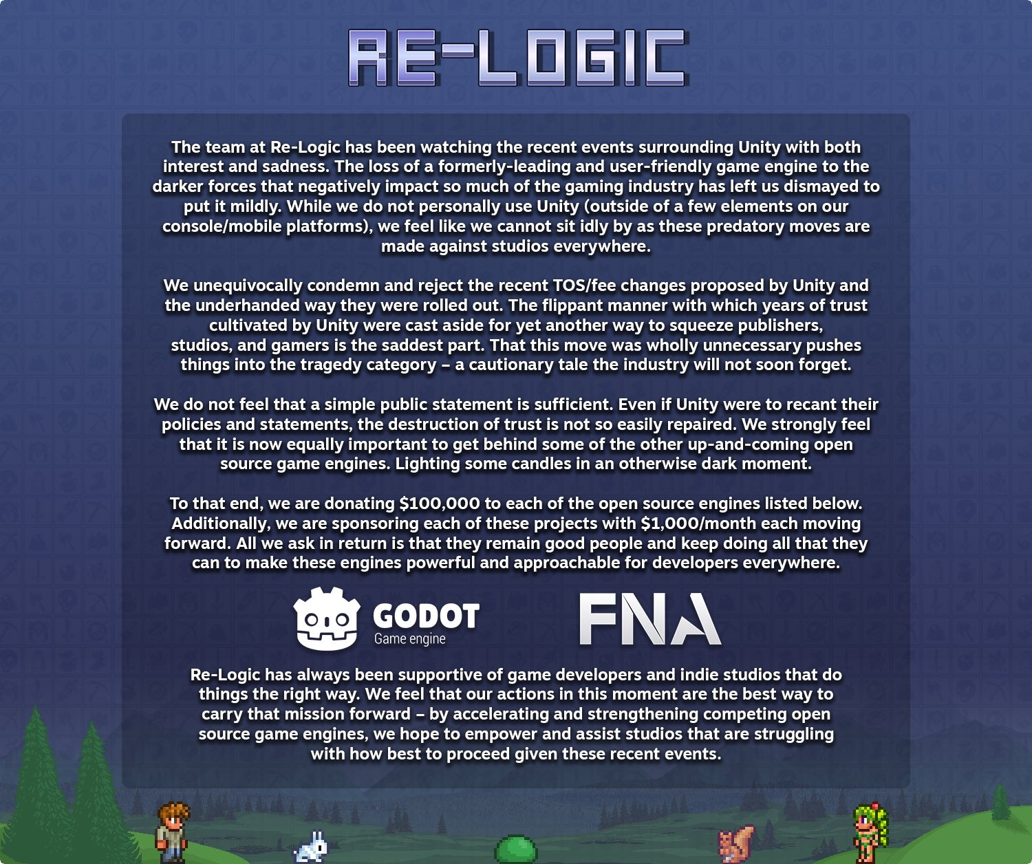最近两周,整个游戏圈都因为Unity准备按下载量收取“安装费”的决策闹得沸沸扬扬。不论是业界知名大厂,还是名不见经传的小型独立游戏工作室,都站在了一起抵制Unity的立场下。在过去的这段时间里,已经有多家游戏开发商宣布会放弃使用Unity了。 而在今日,像素沙盒游戏《泰拉瑞亚》的开发商Re-Logic也同样发布了公告,谴责Unity的行为。不过跟其他厂商相比Re-Logic更加特别,因为不论是《泰拉瑞亚》还是他们正在开发的其他产品,都不涉及Unity引擎。 但即便如此Re-Logic还是做了,并且给出了具体的章程。区别于其他厂商只是选择不使用Unity,Re-Logic的做法是扶持其他的游戏引擎。 RE-LOGIC分别为Godot和FNA引擎捐赠10万美金,并且每个项目都会提供每月1000美元的赞助,尽其所能让这些优秀的游戏引擎易于世界各地的开发人员使用。当然,捐款也赞助支持也是有条件的,那就是这两个游戏引擎必须得“保持初心(开源)继续做好人”。 如果从投入数字来看,RE-LOGIC一口气捐赠20万美元,外加承诺每月1000美元的赞助绝非小数目。甚至可以说用这笔钱,去支付“安装费”也绰绰有余。但恰恰因为RE-LOGIC不使用Unity引擎,所以才让这份声明更具冲击力。 对于一些体量较小的独立游戏开发工作室来说,Unity按照下载量收费的方式对他们的影响非常巨大。这可能导致一些本就对回本和创收遥遥无期的开发者,处境更加艰难。 现阶段业内已经有许多厂商结成了同盟,以Azur Games、Voodoo、SayGames、Homa为首的几家游戏公司发布了联名信,公开抵制Unity的下载收费政策,并关闭游戏内Unity广告。截止到目前,已经有超过500家公司加入了进来,其中还包括国内的Taptap平台。 不久前有消息称,Unity决定调整计费方式。废除原先开发者收入达到一定数额后,按下载量收费的方案,转而使用厂商销售额超过100万美元后,最高收取4%的策略。只是这种计费方式,能取得的效果恐怕有限。毕竟在厂商们眼中,其实只是简单的免费与否的差别。 鉴于Unity新的收费方式将在2024年实装,在接下来的几个月中他们其实还有回旋的余地。当然,口碑方面的问题想要挽回恐怕就没有那么简单了。 至少在外网玩家们眼中,最先提出Unity收费的总裁John Riccitiello,在一份特别的年度榜单上已经超越了暴雪总裁Bobby Kotick...... 那么大家对于近期Unity的做法,又有什么想说的呢? |
