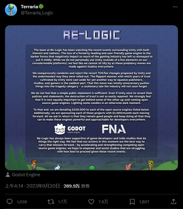 为了抗议 Unity 游戏引擎相关费用的有争议的变化,热门游戏《泰拉瑞亚》的开发商 Re-Logic 计划向两个开源游戏引擎各捐赠 10 万美元,并在未来每月会进一步捐赠。 工作室在推特(X)上发布的一份声明中表示:“Re-Logic 团队一直怀着兴趣以及悲伤的心情关注最近围绕 Untiy 发生的事件。以前业界领先且对用户友好的游戏引擎被黑暗势力夺走,这对游戏行业产生了很大的负面影响,往好了说这让我们感到沮丧。虽然我们本身不使用 Untiy(除了一些主机/移动平台的元素以外),我们觉得我们不能袖手旁观,因为这些掠夺性的举动将影响世界各地的游戏工作室。” 工作室还谴责了最近 Unity 想要按照用户下载安装次数向开发者收取“运行时费用”的举措。工作室说道:“我们明确谴责并拒绝 Unity 最近提出的服务条款/费用变更以及策略不正当的推出方式。” “最可悲的是,Unity 多年来培养的信任被抛弃,转而以另一种方式压榨开发商、工作室和游戏玩家,这是最可悲的部分。这一举动完全没有必要,将一切变成了悲剧——这是行业不会很快遗忘的一个警示。” 工作室表示,将向开源游戏开发引擎 Godot 和 FNA 各捐赠 10 万美元,并且后续将每月向两个引擎的开发者捐款 1000 美元,且捐款似乎会永久持续。《泰拉瑞亚》作为史上最成功的独立游戏之一,开发商口袋看来是很深的。 Godot 和 FNA 均是有开发者社区开发的完全开源的引擎。其中 Godot 是目前许多独立开发者转而使用的主流选择,它原生支持 Python 语言变体 GDscript 的同时,现在已经可以支持 Unity 开发者较为习惯的 C# 以及 C++ 语言,并且也拥有多平台支持,虽然移植要比 Unity 更麻烦一些,但开发者制作出的游戏将完全为他们自己所有。对引擎本身的修改允许它能够做到许多开发者想要的功能。《索尼克缤纷色彩:究极版》就是使用修改过的 Godot 引擎制作的。 另一方面,FNA 则是微软 XNA Game Studio 4.0 Refresh 库的重构,由游戏开发者 Ethan Lee 开发,同样支持多平台。这个引擎则被用来制作了此前 2D 类魂动作游戏《盐与避难所》。 Unity 虽然就“安装费”决策做出了退步并进行了道歉,但据彭博社消息他们并没有准备完全撤销“安装费”收取的计划,只是为其设定了一些列限制,例如游戏终身总收入 4% 的上限。况且即便现在 Unity 完全撤销这一计划也是覆水难收,这家公司已经彻底失去了开发者们的信任。 |