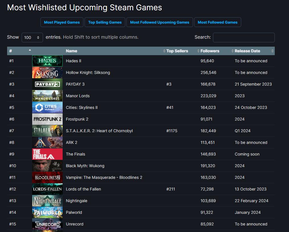 随着《动物派对》的发售,《黑神话:悟空》现在已经成功进入Steam愿望单榜前10,目前排名第10,当前排名第一的是《黑帝斯2》。此外,榜单第3的《收获日3》会在9月21日晚些时候发售,届时《黑神话:悟空》的排名还会上升。