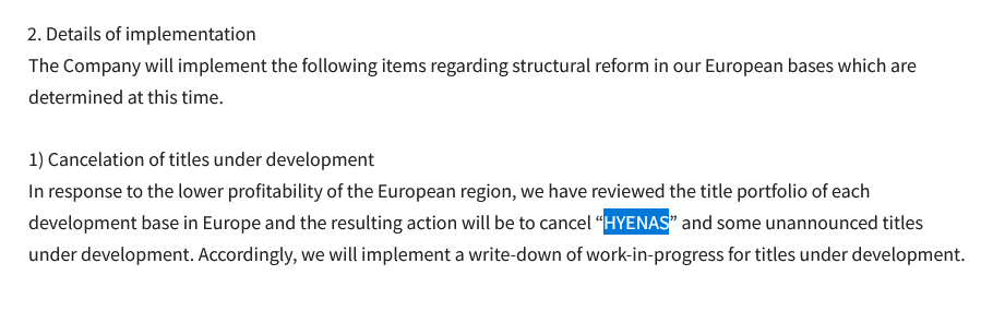 世嘉对CA进行“结构性改革”大裁员《鬣狗》取消