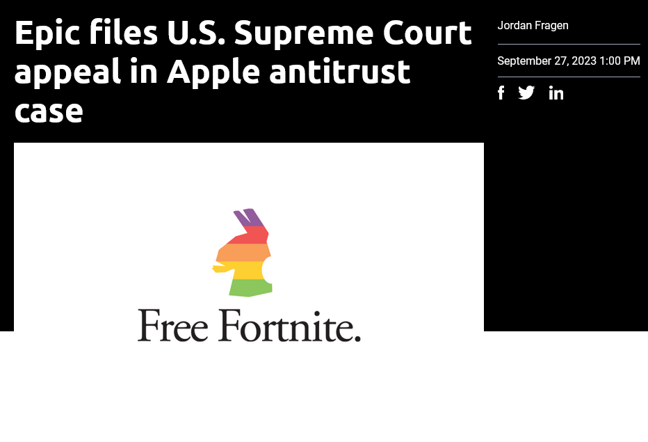 《堡垒之夜》和虚幻引擎开发商 Epic Games 日前再次向美国最高法院复审下级法院提起上诉,要求法院复审一项裁决,该裁决裁定苹果共公司在其 App Store 应用商店中违反了反垄断法。 Epic 最初于 7 月向最高法院提出上诉,要求禁止苹果阻止开发商将用户引导至第三方支付系统。然而根据彭博社报道,这一提议在 8 月被驳回。 根据 GameBeat 报道,Epic 公司现在要求美国最高法院就更广泛的反垄断立法做出裁决,即“如果‘限制较小的替代方案’能够实现相同的利益,同时对竞争的损害较小,那么促进竞争和反竞争的影响都是非法的。” Epic 最希望法院确定的一件事是‘限制较少的替代方案‘是否必须不让苹果承担成本,例如 30% 的分成。 彭博社报道,苹果必须在当地时间 9 月 28 日之前针对 Epic Games 的最新上诉提交请愿书。预计最高法院将在今年年底决定是否受理此案。 |