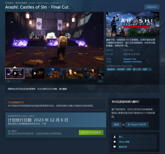 发行商 Skydance Interactive 和开发商 Endeavor One 将《岚:罪恶之城-最终版》的发行日期从原计划的 11 月 17 日推迟到 12 月 6 日。该游戏将通过 PlayStation Store 面向 PSVR2、通过 Steam 面向 PC 以及通过 Oculus 商店向 Quest 2 和 Quest 3 发售。 游戏的 Steam 商店页面已经上线,游戏暂未宣布支持简体中文。 游戏介绍: 你将扮演忍者刺客 Kenshiro,穿行于战国时代的日本,击败在这片土地上为非作歹的恶匪“伊贺六鬼”。潜行进入恶匪盘踞的城池,利用各种武器、忍具和忍术,在追击“六鬼”的过程中巧妙地战胜你的敌人。 在表妹 Ayane 的指导和忠诚狼伴 Haru 的战场协助之下,以最强忍者之姿,解放这片土地。 游戏截图: |