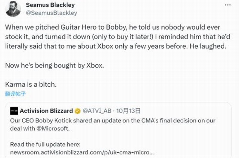 微软已完成对动视暴雪的收购案。在完成收购后,原Xbox联合创始人西默斯·布莱克利(Seamus Blackley)发文,嘲讽动视暴雪CEO鲍比·考迪克现在被Xbox收购,并提到“因果报应”。 布莱克利表示:“当我们向考迪克推荐《吉他英雄》游戏时,他说没人会对它感兴趣,并拒绝了我们(但后来还是买下了它)。就在几年前,他也曾对我说Xbox不会成功,但现在他的公司被Xbox收购了,这就是因果报应。” 这并不是布莱克利第一次抨击考迪克。今年早些时候布莱克利曾透露,他与考迪克相处并不愉快,所以就有了发推嘲讽的这一幕。 值得一提的是,考迪克将于2023年底离开动视暴雪,在剩下的几个月里,他将帮助动视暴雪顺利地融入微软。 |