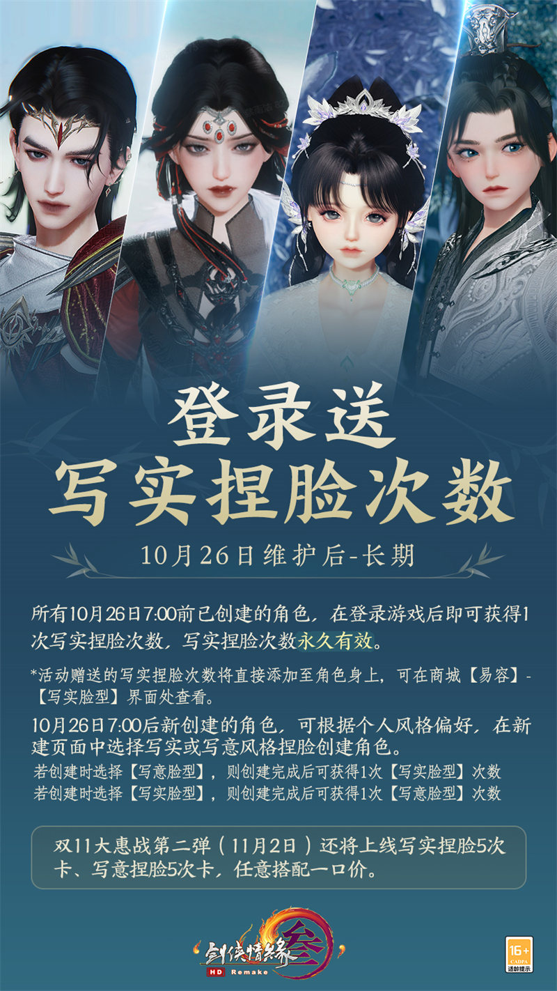 风擎山河势,意驭乾坤移,《剑网3》年度资料片“万灵当歌”今日正式公测,超多内容重磅来袭!PC旗舰画质beta上线正式服,充分提升场景代入感,风格化诠释与呈现,且以水墨国风,展现东方韵味!明年4月还将会更换PC新引擎和推出移动端,内容迭代,持续提升!更多重点内容,一起来看看吧! 更新内容概览 - 【全新画质】旗舰画质beta - 【全新门派】万灵山庄 - 【全新秘境】九老洞;栖灵洞天·旧事 - 【全新地图】银霜口 - 【全新玩法】龙骧驰竞 - 【全新风格】写实捏脸 - 【更多内容】体验优化 奖励爆料概览 - 拭剑宝箱、神威宝箱、师徒值商店、名剑大会段位奖励、绝境战场套装/披风 热门活动概览 - 【登录即送】写实捏脸次数 - 【绝境战场】单人模式·洱海绝境;伪传之争 - 【双11大惠战】第一弹 【全新画质 旗舰画质beta】 旗舰画质beta正式上线,沉浸式体验大唐好风光!一方面,充分提升场景代入感,风格化诠释与呈现,更加注重色彩运用,使不同场景光照颜色之间有细微差别,以水墨国风展现东方韵味。另一方面,角色光照系统更新,拉近自动打光,拉远融入环境,明暗写实渲染细节,背景添加景深效果,更多细节清晰可见。 今日维护后,侠士们可在游戏内【效果性能设置】选项,切换旗舰画质beta效果,切身感受写实光影氛围。 【全新门派 万灵山庄】 全新门派万灵山庄今日正式登场,CG正片重磅首映!亘古以来,万物有灵。以灵为契,可引上古异兽。林间遭遇危机,乘黄与万灵山庄弟子如何协力破局?家园惨遭侵袭,掌门颂少风也将带领弟子们奋力对敌…… CG视频: 新门派大轻功、水上轻功及双人轻功实拍展示同步登场,引翎羽作伴,携花叶过隙,轻盈而又凝聚了万钧之力!点击视频,看万灵弟子携异兽乘黄扶风而起,绝云气,负青天! 轻功视频: 【团队秘境 九老洞】 九老洞是华山龙脉所在,洞中生有龙木,异象丛生,且有神兽麒麟守护。吕洞宾探寻华山龙脉时发现了这一处宝地,见龙脉运转的自然之理后得悟天道,离去时以阴阳太极之理布下阵法以守护龙脉。多年来许多人误入洞中,无一人能破解阵法前往洞底龙脉所在,只见到阵中卦象所推演的幻境,久而久之,此洞被传为仙人聚会之所,故称九老洞。月泉淮为了纯阳至高武学,与神秘方士联手闯入九老洞,华山龙脉危在旦夕,中原武林众多高手驰援华山,携手诛恶。 【五人秘境 栖灵洞天·旧事】 岭南苍梧有一片极高极广的深林名曰“建木海”,雾霭终年不散,故而万灵山庄的弟子们于建木海中搭建了大小不一的营地、树屋,供巡察弟子与误入行人暂用。其中有一月营地叫做观虹,据说雨过天晴之时,可见灿烂虹霞。 乾元元年,一群不速之客打破了建木海的宁静,自观虹营地至掩于建木海之下圣地栖灵洞天,一桩牵扯了三十年的旧事与阴谋,终迎来了结局…… 【野外地图 银霜口】 月泉淮在武狱黑牢中神功大成,击败了洪笑尘,这无疑助长了渤海武人的嚣张气焰,渤海武林与中原武林的终极对决一触即发,各路江湖势力争斗不断。银霜口位于华山,是前往纯阳宫的必经之路。上元二年十月,华山就已被厚厚的大雪覆盖,这使得登山之道更加险峻。因为这场中原武林和渤海武林的约战,原本寂静无人的银霜口变得热闹了起来。 双方直接互下战书,比武从山脚延续到山巅。终年积雪的银霜口,迎来了一轮又一轮的巅峰对局。这期间,竟然流传出来自武狱黑牢石碑上中原各派“武功破绽”的印本,同时渤海武林排行第一的月泉淮也迟迟没有现身……前路迷雾重重,亟待侠士亲自探索! 全新名望云从社也将在完成“银霜口”主线任务后开启,超多趣味奖励等你获取! 【全新玩法 龙骧驰竞】 全新玩法“龙骧驰竞”正式上线!全新名骏坐骑【的卢】限时随机刷新,双方阵营争夺捕获,成功捕获后还可摸取宝堆奖励,参与坐骑与马具拍卖分红! 【全新风格写实捏脸 登录即送免费次数】 雕琢细节,发挥创意,写实捏脸系统同步登场,与写意捏脸系统相互独立,同时存在且互不影响!新增双眼皮等多个可调节选项,贴花自由堆叠与移动,带来更多创作空间!新资料片上线后,所有此前已创建的角色均可登录游戏领取1次免费永久捏脸次数!双11大惠战第二弹中还将上线更多捏脸优惠卡,敬请期待! 【更多内容 优化体验】 除了以上诸多内容之外,我们还对五彩石镶嵌和阵营排队等问题进行了优化,以改善侠士们的游戏体验,更多细节详见更新公告。 此外,10月26日7:00-11月27日7:00期间,绝境战场单人模式“洱海绝境”与趣味模式“伪传之争”限时重启!侠士或可在“洱海绝境”之中参与单人模式战斗,或可在“伪传之争”中拾取随机掉落的全门派部分武学招式,打造不一样的武学搭配!精彩多多,等你体验! 【更多奖励 陆续揭晓】 峥嵘岁月几经秋,万里关山一梦留,神威宝箱、师徒值商店、拭剑宝箱和名剑大会段位奖励缤纷来袭,达成指定条件还可解锁更多精彩表现! 万马奔驰,千军踊跃。全新绝境战场套装“长夜尽”与披风“血黄泉”同步登场! 剑动天地倾,狂歌任我行,新名望外装免费奖励【思海】更添惊喜,不要错过哦! 【双11大惠战第一弹】 《剑网3》双11大惠战欢乐相逢,第一弹活动今日开启!天选计划系列外装“天选兰庭”气质清矜,雍容闲雅,奢华包身礼盒“伴灵引羽”独特旷达,爽朗洒脱!与此同时,六倍积分大回馈、拓印五折、登录即可领取专属折扣券等多重折扣与优惠活