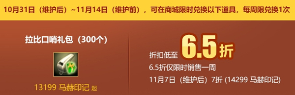 又到一年福利季,今日《洛奇英雄传》拉比口哨礼包与多种实用道具开启限时特惠,福利折扣低至2.5折,走过路过不可错过!现在,一起看看如何参与?又有哪些需要注意的地方吧! 在10月31日维护后至11月14日维护前,英雄们可在游戏内商城以优惠价限时兑换到多种规格的拉比口哨礼包、CVVIP、解除绑定药水、莱伊时装徽章礼盒等实用道具(每种道具限兑换1次)! 需要英雄们注意的是,拉比口哨礼包(300个)的组合,在10月31日维护后至11月7日维护前零食攻为大家争取到了限时6.5折优惠!在11月7日维护后至11月14日维护前,将恢复到7折优惠力度,需要的英雄可要抓紧时间哟! 《洛奇英雄传》一年一度的特惠福利再度限时开启,低至2.5折的优惠福利千万不要错过啦! 《洛奇英雄传》官网地址>>>http://mh.tiancity.com 《洛奇英雄传》官方微博>>>http://weibo.com/51mh 《洛奇英雄传》运营团队 10月31日 |