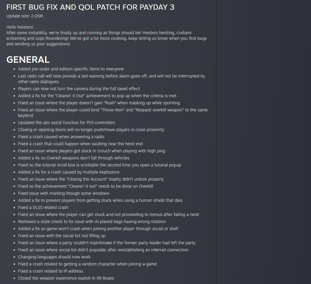 大型多人“零元购”FPS游戏《收获日3》发售以来,因匹配和强制在线等问题,遭到不少玩家的诟病。而官方承诺的高达“200+”的质量提升补丁,从原定于10月5日推出起也一再被推迟。 好在开发商Starbreeze终于在近日推出了1.0.1补丁,该更新Steam版大小为2GB,包含大量修复内容,几乎涉及到游戏的各个方面。 例如更新了PS5手柄的瞄准辅助功能;修复了接听电台导致的崩溃问题;修复了多次爆炸引起崩溃的问题;修复了“关闭账户”奖杯无法正常解锁的问题;修复了房主离开导致其他成员无法匹配的问题等等。 除此以外官方还对游戏中武器、技能、UI、视觉效果等方面,都做了一定的调整与修改,试图为玩家带来更好的游戏体验,不过玩家较为关注的护甲等平衡问题,官方表示会在之后的补丁中逐步改变。 值得注意的是,在等待补丁推出的这段时间里,《收获日3》的Steam在线玩家人数已经降至几千人,而系列前作的在线玩家数量是其的10倍之多。 《收获日3》想要获得成功,恐怕还有很多的路要走。 |