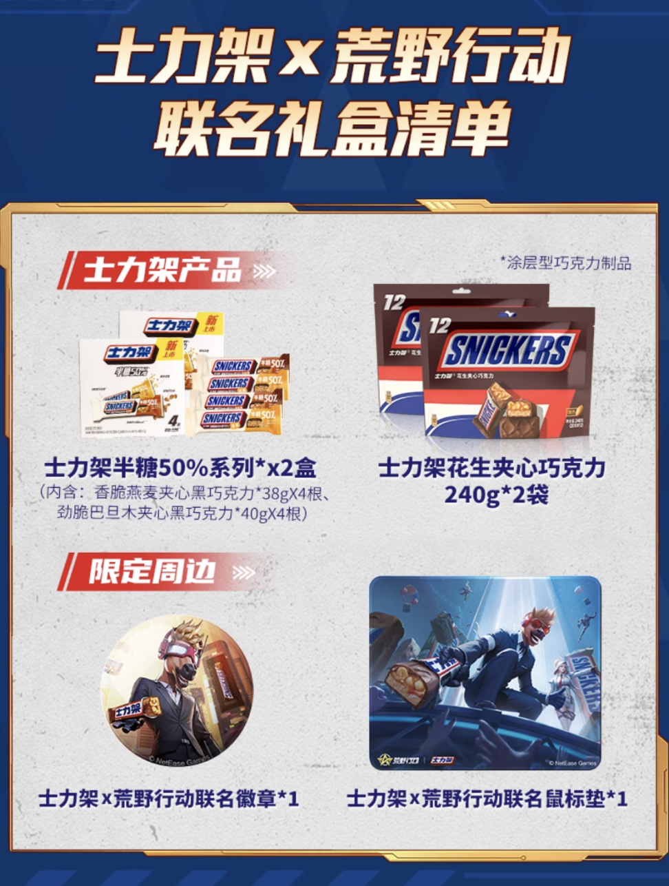 10月31日,《荒野行动》携手士力架为即将到来的6周年庆典开启双十一限时跨界联动,为荒野精英们带来了超强能量补给!快来一起横扫饥饿,野向无限! 游戏高燃时刻,可别能量告急!让我们看看此次《荒野行动》X士力架带来了哪些惊喜! 零食能量大礼空降荒野!横扫饥饿,助力精英决胜巅峰 本次限定联名礼盒以《荒野行动》中代表胜利和荣誉的【五芒星】符号与经典游戏元素【空投箱】为设计灵感,融合士力架经典配色,实在是趣致盏鬼的联动。《荒野行动》致力于让精英们在荒野大陆中感受极致的输出体验,全新玩法刺激对抗在场景上最大程度还原体验的真实感。 精英们为了在荒野大陆中确保生存,需要等待空投箱并使用药品、绷带等方式治愈自己;而在现实生活中也少不了士力架来补充能量,横扫饥饿! 目前《荒野行动》X士力架联名礼盒已经在天猫士力架官方旗舰店、京东德芙京东自营旗舰店上架,搜索“荒野行动士力架”即可带回家,新品半糖士力架和经典原味花生焦糖士力架让精英们能量闪充,开局即能掌控全场,更有限定联动徽章与鼠标垫周边免费送! 更有惊喜优惠福利,限定降落伞外观免费送! 本次联名最大的神秘惊喜,即购买礼盒就可免费获得士力架联名款降落伞外观和两枚至尊军需勋章,精英们只需通过礼盒内道具卡片上的指引完成兑换,即可在游戏内的服装道具为自己的游戏角色进行装饰,打造专属独一无二的游戏角色造型! 《荒野行动》为了吸引更多年轻人的目光,跨界联名选择品牌调性高度契合的士力架一起爆发出更大的能量,建立与年轻消费者的共鸣,无论在生活里还是游戏中,一起横扫饥饿,迎接挑战,做回自己。 此次合作还为荒野精英们准备了玩家专属优惠券,即日起在天猫士力架官方旗舰店或京东德芙京东自营旗舰店,找客服发送暗号“荒野行动,野向无限”即可领取(仅限前500名下单付全款用户使用),优惠数量有限,精英们还不快冲?! |