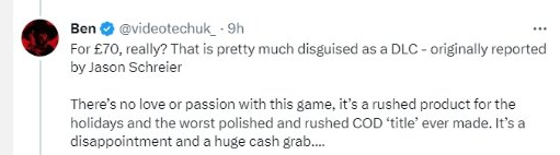 原定于11月10日正式发布的《使命召唤:现代战争3》(以下简称:COD20),在今日上线了战役模式的抢先体验版本。作为市面上“年货游戏”的代表作品之一,每一年动视都会为玩家带来该系列的新作。 较之往年,《COD20》变得更大也更贵了。234.9GB的内存要求和70美元的售价,对不少玩家来说本身就代表着门槛。而本作的玩法内容,却没有太大的提升,这就导致了《COD20》的抢先体验版本所收到的好评就比较有限了。 外网博主charlieINTEL在体验过后抱怨战役模式的流程太短,称自己仅仅用了3-4个小时,就已经完成了所有的单人内容了。“开放式的战斗任务只是特种行动,并没有多让人兴奋。”作为COD系列的资深大佬,他只给战役剧情玩法打出了7分。 而如果说charlieINTEL身为公众人物,还会比较照顾动视的想法的话。普通玩家对于《COD20》的评价,就更加简单直接一些了。一些人认为,COD系列的现代战争三部曲一直在走下坡路。到《COD20》时,问题已经比较大了。 玩家目前指出的几大问题主要包括: ①PS5平台没有白金奖杯 ②《COD20》不值70美元的售价 ③《COD20》看起来像是前作的DLC 目前对于玩家们提出的诸多问题,动视只对234.9GB的游戏文件进行了解答。动视表示:“因为游戏首发内容增加了僵尸模式、上代继承的物品,及战区地图文件等。目前已经在优化了,最后的总体容量会比上代少,玩家们如果觉得存储空间吃紧可以卸载一些不玩的模式。” 不过即便是《COD19》的游戏文件大小也在180GB以上,这对玩家们的内存空间依然是个挑战。 COD系列游戏当前已走过了二十年,该系列最早崭露头角,就是得益于主创们对单人战役玩法的塑造。只是在不断推出新作的过程中,动视的侧重点渐渐发生了转移。团队竞技玩法,愈发受到关注。 《使命召唤:战区》的上线,对整个COD系列有着极为重要的影响。不论是增强玩家黏性,还是提升游戏热度乃至于创收方面,都因此有了显著的变化。趁热打铁,动视后续还推出了《战区2》,至于COD系列的单人战役玩法,存在感则变得越来越低了。 现阶段《COD20》还未正式上线,玩家们只体验到了一部分的内容。因此也希望在游戏真正上线后,能够为大家带来更丰富的玩法内容吧。 |