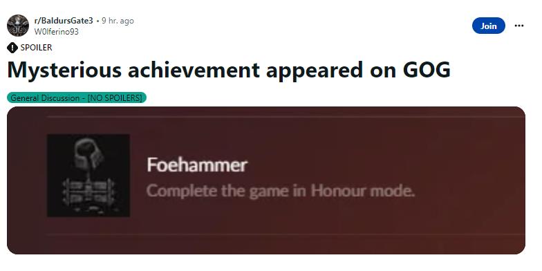 根据GOG商店信息显示,《博德之门3》最近通过补丁更新了一项新成就:“以荣誉模式通关主线故事”,荣誉模式是比策略模式更难的新难度选项,在拉瑞安工作室的另一部作品《神界:原罪2》中也出现了该模式。不过,到目前为止,玩家还无法在游戏中选择荣誉模式。