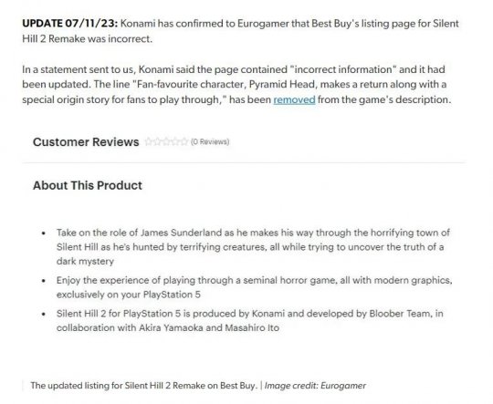 我们此前报道过《寂静岭2:重制版》将包含三角头起源故事的资讯,该消息来自百思买的预购清单,它被归类为“特殊背景剧情。不过现在,根据科乐美向外媒Eurogamer提供的一份声明,科乐美表示百思买页面上提到的三角头起源故事是“不正确的信息”,目前该信息已被删除。