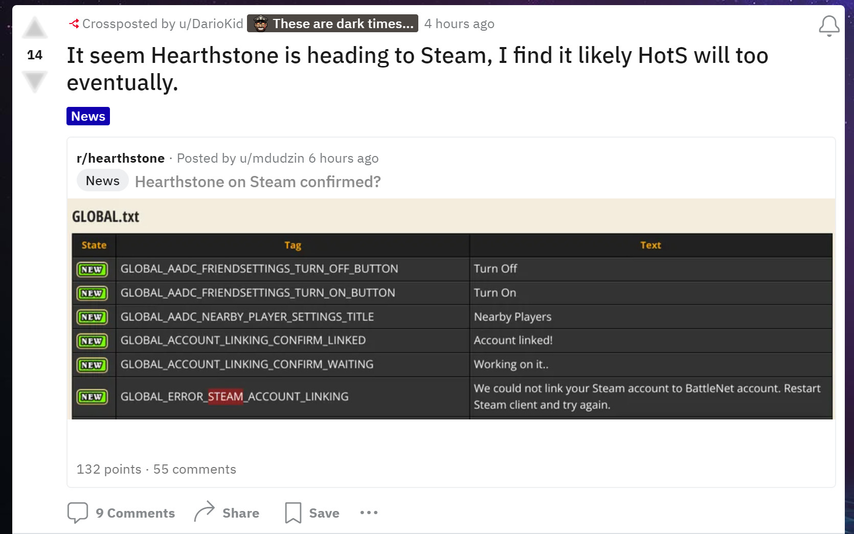 继《守望先锋2》、《暗黑破坏神4》后,下一个登陆Steam的暴雪游戏很有可能是《炉石传说》。 国外网友发现《炉石传说》新发布的28.0补丁,数据挖掘发现一条“无法将Steam帐户链接到战网帐户”的警告信息。 此外网友还发现了一个Steam账号链接窗口的贴图: 《炉石传说》是一个免费集换式卡片游戏,故事背景基于魔兽系列的世界观,玩家可以另行购买卡牌包。游戏发布时包含300张卡片,额外卡牌包可通过游戏内获取,或者以每包1美元的价格购买。 《炉石传说》于2014年3月11日在Windows,MacOS平台推出,2014年4月登陆了iPad,2014年12月登陆了安卓平板电脑,2015年4月登陆了iPhone和安卓手机。 网友:《风暴英雄》最终也会登陆的,如果登陆了我会立马删了《DOTA2》…… |
