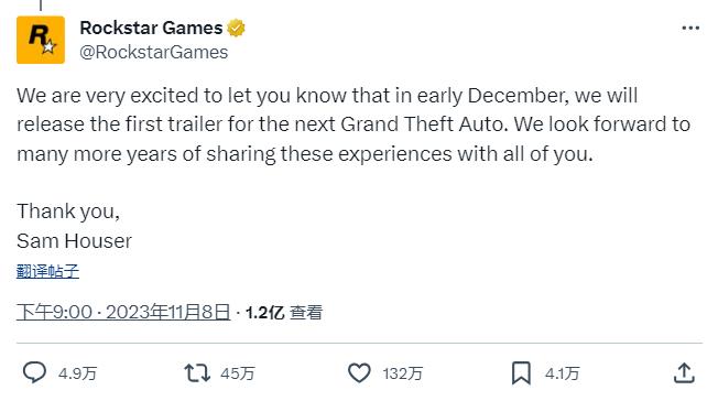 11月8日晚些时候,R星发布公告确定将在12月初公布《GTA6》的预告片,正如预期的那样,这个公告的受欢迎程度爆炸式增长,在几个小时内呈指数级上升。在公告发布五个小时后,该帖子成为了推特最受欢迎的游戏推文,截止到目前,点赞量已超132万。
