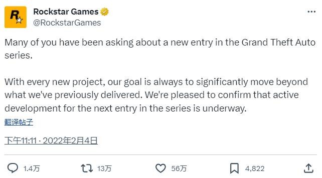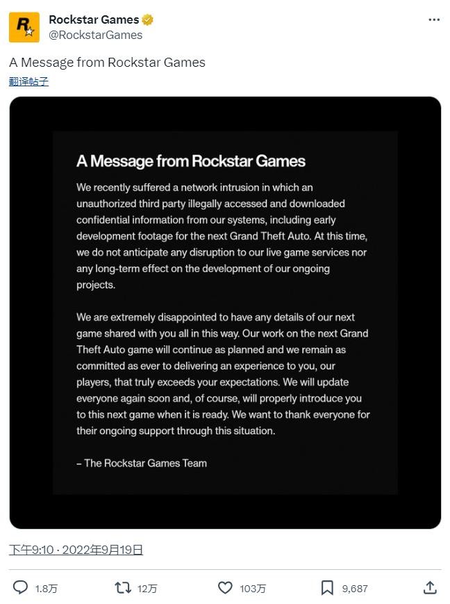有趣的是,第二受欢迎的推文也与《GTA6》有关,在去年,开发中的《GTA6》游戏片段被黑客泄露时,R星发布了一份解释声明,该帖子获得了超过100万点赞,是推特第二受欢迎的推文。另外,R新在2022年初首次确定《GTA6》正在开发的推文也获得了56万点赞。