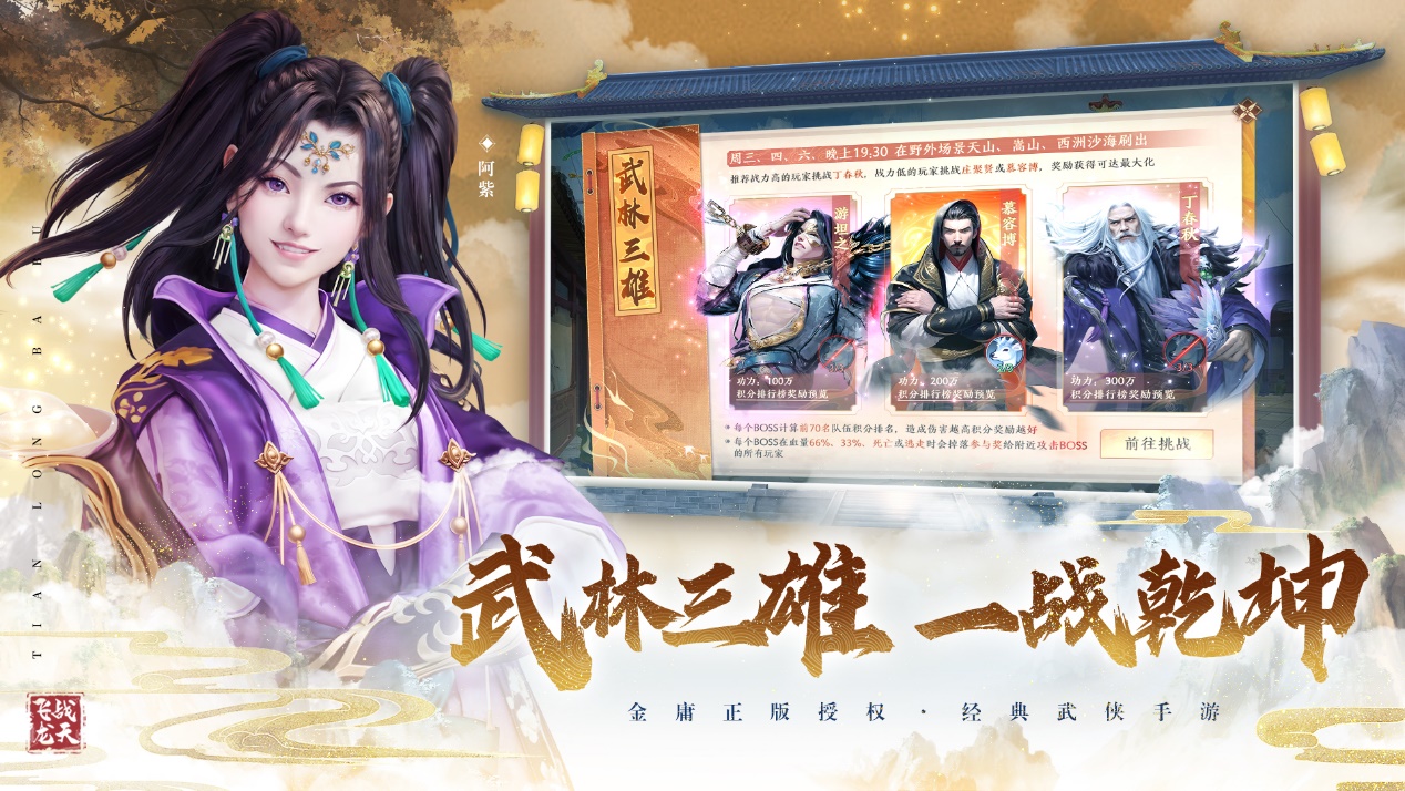 天地惊风雨,游龙啸云归《天龙八部2》手游重磅资料片【龙腾万里】今日公测!全新门派大理即将登场,门派专属试炼任务天龙试炼等你一战。豪侠系统、武林三雄、攻击属性转换、帮派五福锦鲤等全新玩法同步登场,解锁不一样的江湖新体验! 天龙试炼 人皇觉醒 天龙寺铮铮龙鸣响彻天际,大理皇室的前身居然是隐秘组织?全新门派大理专属试炼任务来袭!段王爷诡异遇刺,叛臣杨氏的背后究竟何人推波助澜三国交兵不断,大理皇室决定重新招募江湖豪杰,中兴大理! 大理出身天潢贵胄,以远程外功见长。得益于段氏深厚的武学渊源,大理门派可谓全属性精通,配合属性调整可以针对任何门派进行有效克制。 云游戏上线 随时随地即刻开玩 《天龙八部2》手游云·游戏版本上线!超小包体即可提供完整游戏体验,各位大侠将不再受设备、储存空间的限制,尽情享受天龙江湖的快乐。得益于云技术的加持,超小包体依旧能够保持《天龙八部2》手游的高画质、高帧率、低延迟的游戏体验,前往《天龙八部2》手游官网一键开玩! 豪侠挚交 江湖同行 少年意气重,结交五都雄。全新豪侠系统开放!与《天龙八部》原著豪侠缔结深厚羁绊,了解与天龙江湖的故事。指定豪侠达成特殊羁绊效果还将额外获得战力和属性的加持!更多豪侠系统玩法还请各位大侠亲赴江湖探索。 五行轮转 出奇制胜 巧匠吕正臣根据全新门派大理的武功路数开始进行属性攻击转换方面的研究,在全新资料片中,各位大侠可以根据自身需求进行属性攻击的转换。不同门派也即将产生更多的策略搭配,全新门派体验与战斗技巧来袭,你准备好了吗? 武林三雄 一战乾坤 游坦之、慕容博、丁春秋武林三雄现身江湖,还望各位大侠携手力挫强敌!全新首领争夺战武林三雄开幕,与好友共同讨伐三雄,解锁海量豪华奖励! 帮会锦鲤 传递五福 在新版本上线后,各位大侠可以在晚间帮会驻地开启五福锦鲤社交玩法!团队协作进入不同限时副本击杀怪物,即有机会掉落随机五福卡牌。集齐五福合成幸运宝箱,多出的卡牌还可以赠与同帮会成员,一起抽取锦鲤大奖! 沙海迷踪 古城蜃景 全新挑战副本——沙海蜃楼开启!西洲沙海每至黄昏都会浮现出一座古城蜃景,百年前明教的神秘部署欲意何为?古代明教众人最坚定的信仰在黄沙之下被掩埋,而今各位大侠将使其重现世间。 迎大理 海量福利登场 日常活动双倍掉落活动限时开启,活动期间侠士们参与各个等级的挑战副本、日常副本,将享受双倍奖励掉落的福利,双倍惊喜,双倍惊喜!双十一系列活动诚意满满,海量养成奖励登录即送! 《天龙八部2》手游全新资料片今日上线!全新豪侠系统、帮会锦鲤等玩法等你体验,叫上好友共同讨伐武林散熊! |