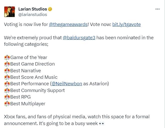 在2023 TGA游戏奖项提名名单公布后,《博德之门3》总共获得了8项提名,包括:年度最佳游戏、最佳游戏指导、最佳叙事、最佳配乐和音乐、最佳表演、最佳社区支持、最佳角色扮演游戏、最佳多人游戏,开发商拉瑞安工作室发文庆祝了这一成就,并表示将在本周发布《博德之门3》Xbox版的发售日期。根据之前泄露的消息,发售日期可能为12月6日。