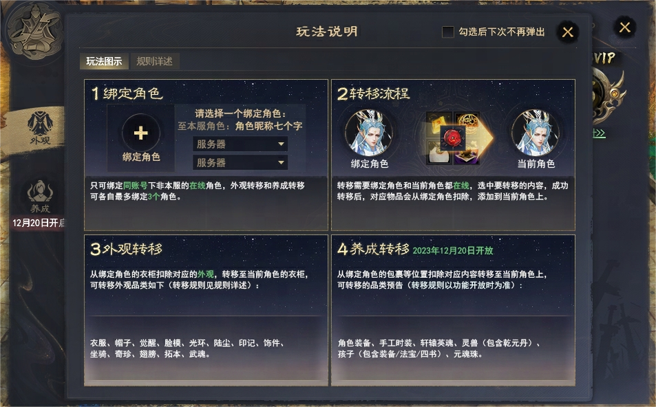 随着天下史上首个转生服【定乾坤】即将开服的消息一出,少侠们亦纷纷关注起与之同步开启的“斗转星移”计划。据《天下3》官方前几次的爆料可知,“斗转星移”计划的第一期将在新服落地,以更有诚意的方式,让大家更轻松地重回大荒,也为前来新服征战的少侠助力。 对于这一计划,不少少侠表示非常期待。为了让大家能进一步了解该计划的讯息,近日官方为少侠们推出更为详尽的爆料,为大家详解其中外观、数值继承等玩法。话不多说,下面一起来看看吧~ 外观继承,落地新服,就做人群中最靓的仔! 许多少侠不约而同地决定前往新服【定乾坤】征战,为的就是获得酣畅淋漓的PVP体验,但这并不会动摇他们的变美之心。想一落地就成为人群中最靓的仔?斗转星移计划可以满足你的愿望! 新服【定乾坤】开服后,斗转星移计划的外观继承功能开服即生效,只需达到一定的条件,同一账号名下拥有的外观,包括时装、坐骑、奇珍、翅膀、脸模、饰件等多个品类,均可无缝转移至新服。 在斗转星移的操作界面上,少侠可以对原有角色和新角色进行绑定。此时,少侠可以在界面左侧查看当前可转移的外观品类(包括时装、坐骑、奇珍、翅膀等10大品类)以及每个品类能转移的数量。可转移的品类、数量,与少侠当前满足的条件有关。根据少侠转移的内容,会增加新角色一定的禁交易时长。 少侠们可以从原有角色的衣柜中,浏览允许转移的外观,如果某一款外观拥有多件,也会为少侠平铺展示,方便大家迅速了解外观的获取情况。选中自己各个品类中心仪的外观,最终点击确认转移后,外观将从原有角色上转移至新角色。同时,原有角色的衣柜中对应的外观会被删除,如仅有一件当前外观,转移后此前达成的相关事迹也会被删除。 数值继承,彻底颠覆养成体验! 除了心心念念的外观,让少侠更难以割舍的,还是自己在老服辛苦打造的各种数值。 虽然到达新服后,《天下3》为大家提供了史上最大力度的成长福利——少侠创建角色后,可马上直升79级,大大减少升级练号的烦恼,同时获得成长大礼包,内含大量技能点、副本套装,助你逐步武装自己。但对不少少侠而言,和原有的角色相比,还是存在较大的差距,如果各方面还要从零开始打造,的确是个巨大的工程。 不可否认,养成的负担,始终是阻碍各位少侠回归的一大门槛。 因此,这一次,《天下3》希望彻底颠覆它! 养成属性开放转移,属性封印维持平衡 在斗转星移计划中,《天下3》开发组为大家准备了数值继承的功能。该功能不会和外观继承一样,开服就开启,而将在12月20日版本中开放。 这个功能,将允许少侠们将老角色中装备、灵兽、孩子、轩辕英魂、元魂珠等养成属性转移到新服的角色之中,让一切不再是从零开始,让他们再度为你带来助力。 以上述五种养成属性为大类,将分别显示大类下可转移的细分类型、可以转移的数量,转移成功后,原有角色上对应的养成属性将被删除。 当然,在减轻少侠们养成负担的同时,开发组表示也要维持新服中数值的相对平衡,才能让这个服务器拥有良好的生态,让少侠在这里能够尽情激斗!因此,他们在开放数值继承的功能时,也将会开启服务器属性封印,对本服的养成属性作一定程度的限制,让每个人的属性没有过大差距——不要顾忌,这里就是要让你战个痛快! 首期测试即将开启,未来更多玩法助你轻松回归大荒! 值得一提的是,外观继承及数值继承系统,在满足相关条件的前提下,最多分别支持【三个角色对一个角色】转移,也就是说,你可以将不同角色中的不同养成属性转移到新服角色中,让他成为兼有三家之长的佼佼者! 当你当年服务器账号上的数据,以一种全新的方式重生时;当你的“老伙计”以新的面貌,陪你再度闯荡大荒、征战天下时,开发组相信少侠们会在这里,碰撞出新的故事、创造新的记忆,这就是斗转星移计划的初衷。 【定乾坤】作为天下史上首个转生服务器,将是《天下3》的亿万少侠回归计划——“斗转星移”计划的第一期测试,开发组表示非常期待它在正式落地后,让大家能更轻松地征战新服。因此,他们会密切关注大家对此的反馈,如果实施情况良好,未来也会考虑开发更多更利于少侠回归的新玩法,推出更简便体验更好的方式,帮助大家重回大荒! 看完以上爆料后,少侠们是否对“斗转星移”计划的了解又更多了一点呢?11月22日,即将在【定乾坤】正式开启,对以上玩法感兴趣的少侠,不妨前往页面预约体验哦~ |