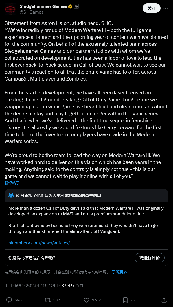 《使命召唤20:现代战争3》在推出后其单人战役因为剧情过于仓促且时长很短导致了许多玩家的批评。随后一篇彭博社报道援引未透露姓名的开发人员声称,该作实际上只是临时替代原本计划今年推出的《使命召唤》作品,而单人战役开发只用了不到正常战役的一半时间。 目前,开发工作室 Sledgehammer Games 回应了这一报道,工作室负责人 Aaron Halon 在社交媒体上发表了一份声明。 在声明中,负责人写到:“从开发一开始,我们就全身心投入于创造下一款突破性的《使命召唤》游戏。早在我们完成上一款游戏之前,我们就从粉丝那里听到了响亮而清晰的意见,表达了留在同一个系列中游玩更长时间的愿望。” 他总结道:“我们一直在努力实现这一多年酝酿的愿景。任何与此相反的说法均不是事实。” |