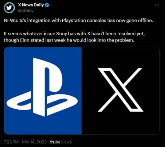 11月13日索尼宣布已经停止在PS5和PS4上支持X(推特)联动,日前X推特最新回应与PS合作计划,表示正在考虑直播流媒体领域展开合作,不过截止本文发稿索尼并没有回应。