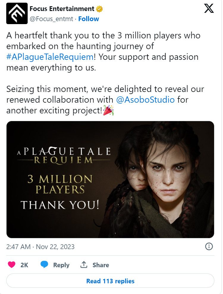发行商Focus娱乐在Twitter上宣布,Asobo Studio开发的《瘟疫传说:安魂曲》现已达到了新的里程碑:已有超过300万玩家。上一次官宣的里程碑是在2022年11月2日,在首发几周后官方宣布玩家人数超过了100万。 Focus还确认他们正在和Asobo开发另外一个“令人兴奋的项目”,外界猜测这个神秘项目就是《瘟疫传说3》。 今年7月,根据Asobo曝光的招聘广告,虽然大部分职位是“飞行模拟”团队招募,但也有四名是“瘟疫传说”团队,分别是高级AI程序师,VFX特效美工,高级游戏动画师和高级游戏设计师。 考虑到招聘广告发布时,《瘟疫传说:安魂曲》已经发售超过了9个月,而第一代游戏没有任何DLC,很明显这次的招人广告是为续作准备的。 《瘟疫传说:安魂曲》登陆了PC,PS5,Xbox Series X|S和任天堂Switch(云端),本作也上线了Game Pass。 |