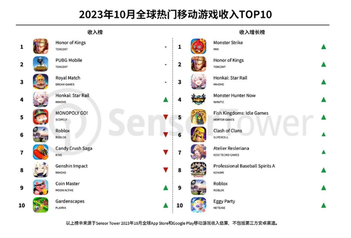《梦幻花园》 休闲三消 《王者荣耀》在10月狂揽2.2亿美元的收益,继续蝉联全球手游畅销榜冠军,这种情况早已常态化,再过两年或许都看不到能超越他的作品。得益于游戏在上个月的更新,以及发布的诸多新皮肤,玩家们的热情被带动起来。 排在榜单第二的《PUBGM》也已经很久没挪过窝了,上个月他们以1.37亿美元的收入位列榜单第二名。而第二名也是近几年来其他的手游作品唯一能够觊觎的位置,更多时候榜单的前两名都由这两款腾讯游戏所包揽。 《皇室比赛》是本期榜单上排名最高的国外游戏,其作为休闲游戏的代表作品,取得了相当不错的名次。由于海外玩家对休闲游戏情有独钟,所以前十榜单上的三消游戏多达四个。常常关注全球手游收入榜的玩家,想必都注意到了这个细节。 排在第四《崩坏:星穹铁道》和第八的《原神》都来自于米哈游,二者在10月份更新了新角色,前者还创下了10月收入的首个峰值,并登上中国iPhone畅销手游榜榜首。在海外市场的优秀表现,帮助他们在榜单上占据着一席之地。 而位居第五的《大富翁GO》,则是本年度休闲游戏赛道上的新锐。以传统的《大富翁》桌游为蓝本创作,《大富翁GO》还融入了符合现代玩家玩法习惯的要素,它在发布7个月后创造了10亿美元的总收入。 但很多人所不知道的是,官方最初对《大富翁GO》的定位是《皇室战争》那样的塔防策略玩法,但在后续开发过程中,主创们对游戏的发展方向进行了调整。直到《大富翁GO》变成现在这样,更贴近于现实版桌游的样子。 截止到现在,《大富翁GO》已经成为了2023年下载量最高的手游作品,同时也是历史上最快达成10亿美元收入的游戏。当下,手游市场依然充满活力,缺少的其实是新颖的玩法。不知道在2023年的最后两个月中,是否还有望看到新的作品上榜。 那么在10月份的榜单中,又有多少是大家正在接触的游戏呢? |