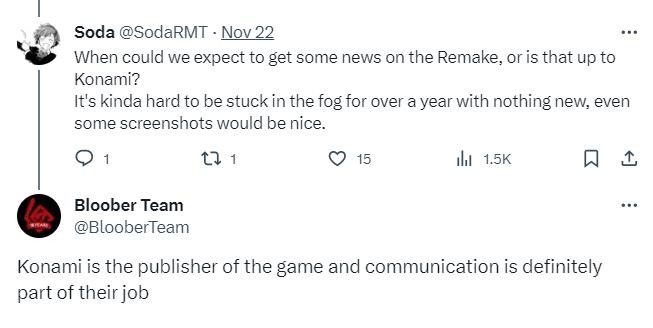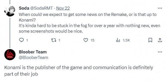 而近日,有玩家在推特上询问了开发商Bloober Team关于《寂静岭2:重制版》的一些信息,Bloober Team则回应表示,《寂静岭2:重制版》没有被取消,游戏开发工作目前仍在进行中,而游戏的更多情报信息将由科乐美来决定何时公布,他们是游戏发行商。