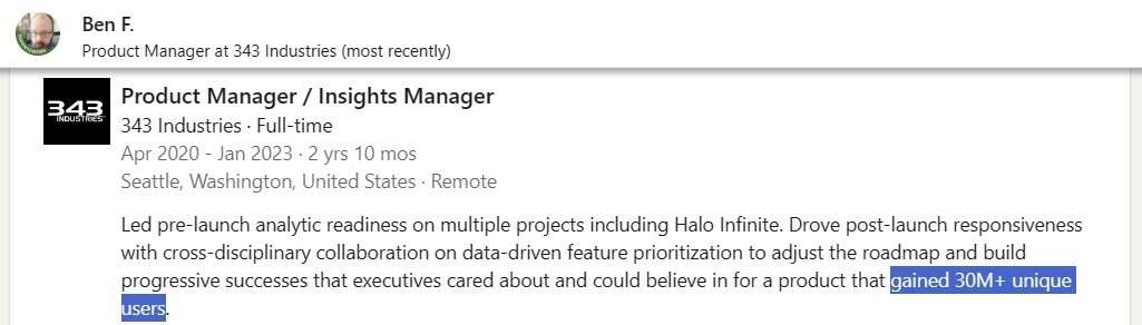 据外媒Exputer发现的343产品经理BenF的领英简历,《光环:无限》有超过3000万独立玩家游玩。 由于Ben F是从2020年4月至2023年1月担任产品经理,因此这个数字是2023年1月之前的数据,这意味着《光环:无限》实际游玩人数会更高。 需要指出的是,《光环:无限》是微软第一方游戏,因此玩家可通过Game Pass游玩,而且其多人模式也是免费。 微软上一次公布《光环:无限》游玩人数是在2022年1月25日,当时官方宣布《光环:无限》玩家人数超过了2000万,是《光环》系列历史上首发玩家最多的游戏。 《光环:无限》单人战役于2021年12月推出,多人游戏2021年11月16日免费上线,Steam评价褒贬不一。 |