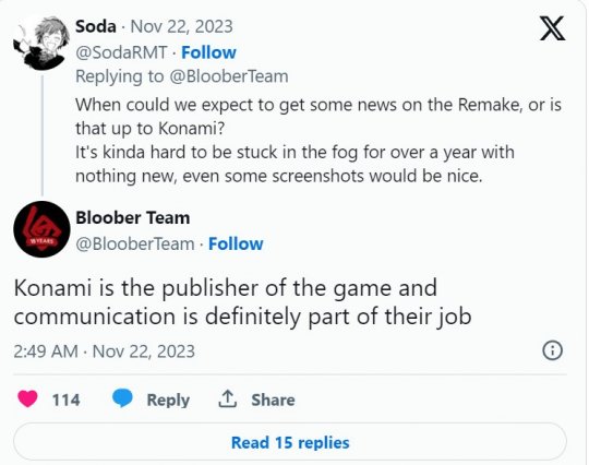Bloober Team开发的《寂静岭2:重制版》近几个月来没有公布太多重大消息。它的Steam页面有所更新,Konami最近否认了“三角头将有特别原创剧情”的消息,但目前还是没有发售日的消息。 幸运的是,Bloober Team在Twitter上确认该游戏并未被取消。而对于公布《寂静岭2:重制版》的新细节,Bloober Team表示新细节将由Konami说了算,“Konami是游戏的发行商,沟通肯定是他们工作的一部分”,似乎大有指责Konami缺乏宣传的味道。 外界猜测《寂静岭2:重制版》有望于12月7日的TGA颁奖礼上公开更多细节。该作目前确定登陆PC和PS5,PS5为主机限时独占,共12个月,本作没有加载页面。 |
