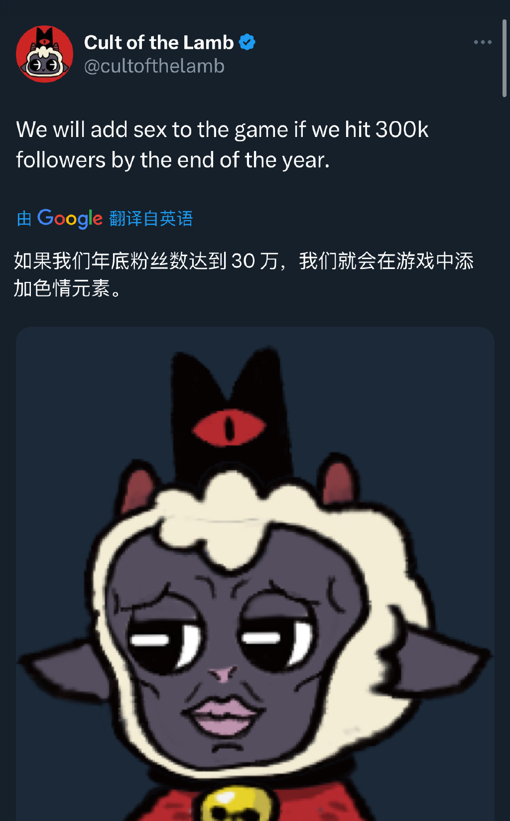 在2022金摇杆最佳独立游戏的评选中,由Massive Monster 开发的《咩咩启示录》拔得头筹。这款集合了肉鸽战斗和种田玩法的游戏,以其独特的画风和特殊的设定深受青睐。并且直到现在,官方依然在保持着更新。 时隔一年多,昨日《咩咩启示录》官推突然发布了一则动态,表示如果粉丝数在年底之前破30万,就会在游戏中添加“成人内容”。这则动态怎么看都是开玩笑的意味更多,但却迅速吸引了海量的网友。 此动态发布后2小时,该账号的粉丝数就达到了30万,并且还有进一步上涨的趋势。而官方也再一次表明了“言出必行”的态度,保证会在2024年年初进行更新。虽然大家对于如何在这款萌系游戏里添加“成人内容”表示怀疑,但这些该是主创们需要考虑的事情。 《咩咩启示录》是一款画风清奇的游戏,在本作中,玩家需要建立自己的教派,遍历大陆上神秘无比、风格迥异的各个区域,笼络一群笃信森林的忠诚信徒,广散你的真言,最终一统全境,成为唯一的正教。 萌系画风外加暗黑内核,《咩咩启示录》给玩家带来了非常奇特的游戏体验。游戏里既有各种画风可爱的教徒,也有残酷的献祭要素。玩家们所操纵的小羊虽然是“教主”,一面得肩负起照顾整个部落的责任,又得通过跟邪恶可怖的Boss战斗来获得更多资源和战利品。 如果你曾体验过《冰汽时代》,多少会对《咩咩启示录》中的教徒产生跟末世中民众那般的感觉。因为他们既不会自己照顾自己,还时不时随地大小便。玩家以堂堂教主的身份,却必须给手下教众铲屎,否则粪便的堆积就会引发疾病...... 如果《咩咩启示录》只有单一的肉鸽动作玩法,亦或是模拟经营玩法,那么它都达不到现在的高度。可将二者相结合,游戏的整体内容就变得非常丰满了。当然,Massive Monster 团队优秀的美术风格,也对游戏的成功起到了巨大的提升作用。 而早在上周,《咩咩启示录》曾发布了下一次免费大型更新内容「血肉之罪(Sins of The Flesh)」的预告,这个预计将于2024年进行的更新将包含全新剧情和功能等内容。如果不出意外的话,此次官方承诺的“成人内容”也将在那时上线。 那么大家觉得《咩咩启示录》的下次更新,将会从哪些方面着手呢? |