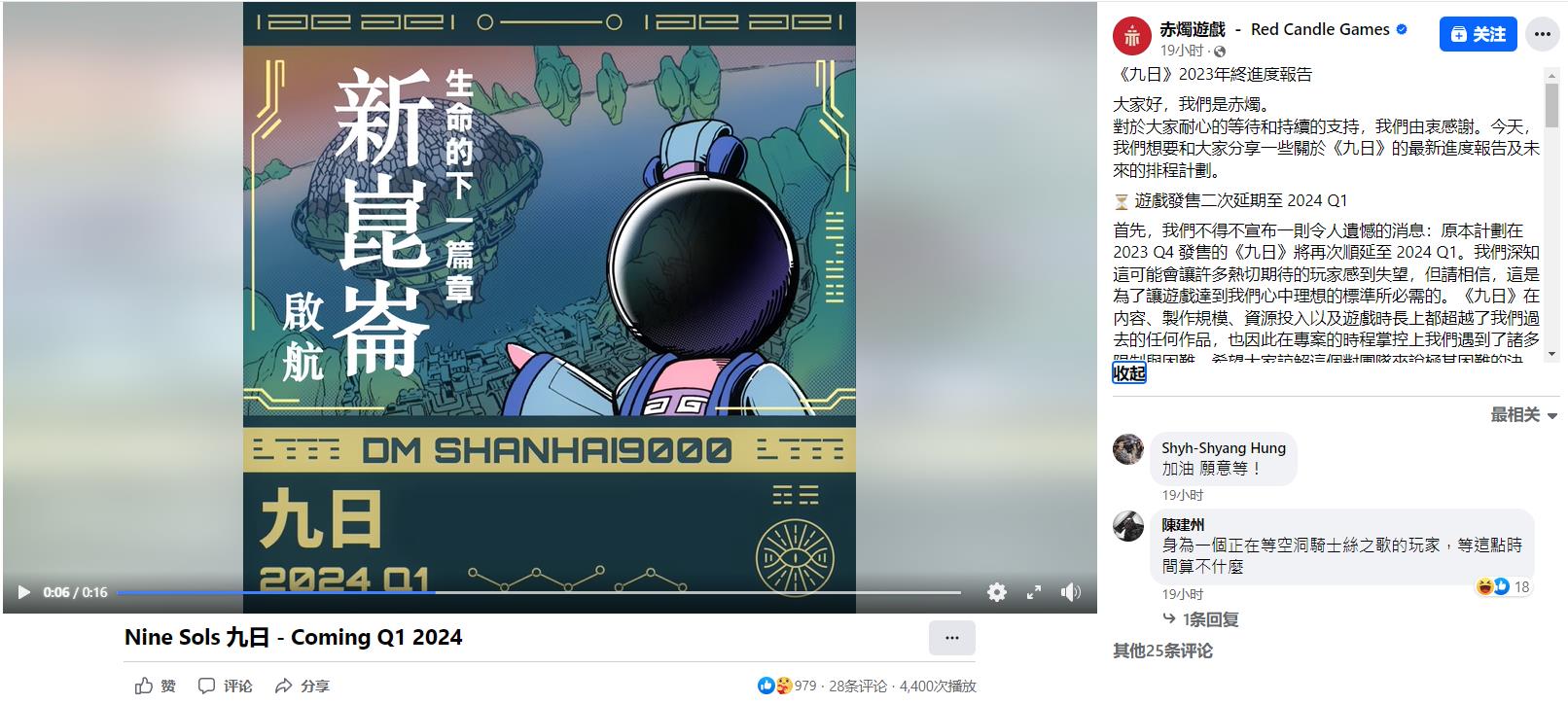 曾开发过恐怖解密游戏《返校》的赤烛游戏工作室,近日在官方Facebook上宣布,正在开发中的卡通类魂游戏《九日》将二次延期,预计于2024年第一季度推出。 面对延期的消息,赤烛官方也表示“我们深知这可能会让许多热切期待的玩家感到失望,但请相信,这是为了让游戏达到我们心中理想的标准所必需的”。 《九日》是一款结合道教科幻与上古神话的2D平台动作冒险游戏,强调格挡机制和节奏明快的战斗、配合独特的道家朋克背景,刻画出别具特色的手绘世界。 玩家将在游戏中扮演主角羿,面对统御新昆仑的九位太阳,只身踏上一条复仇血路。 此前本作通过众筹取得了1千3百多万新台币(约311万人民币)的众筹资金,并且在Steam平台上发布了试玩demo,游戏暂定将登陆PC和MacOS。 |