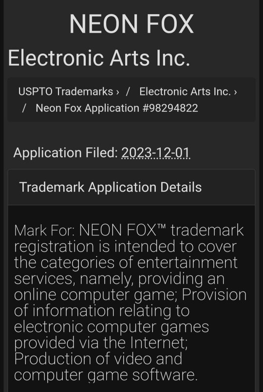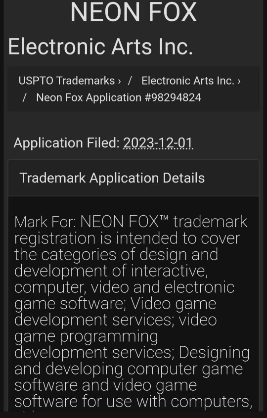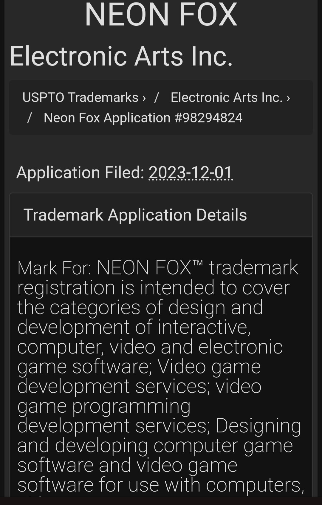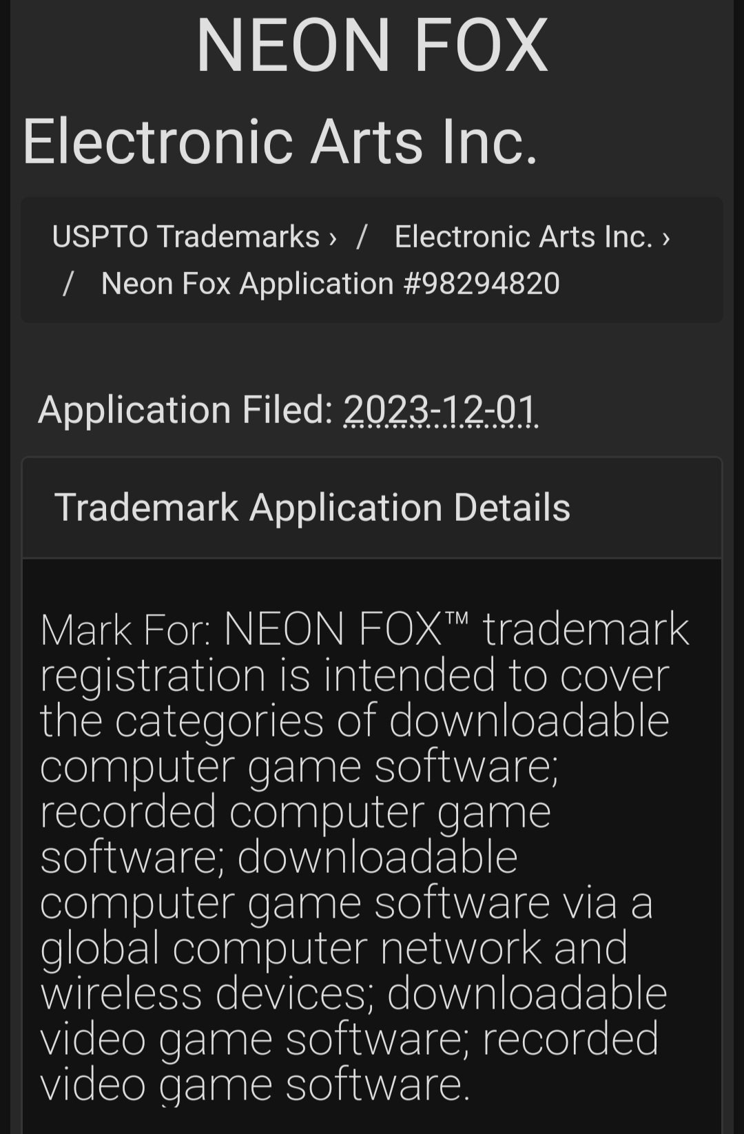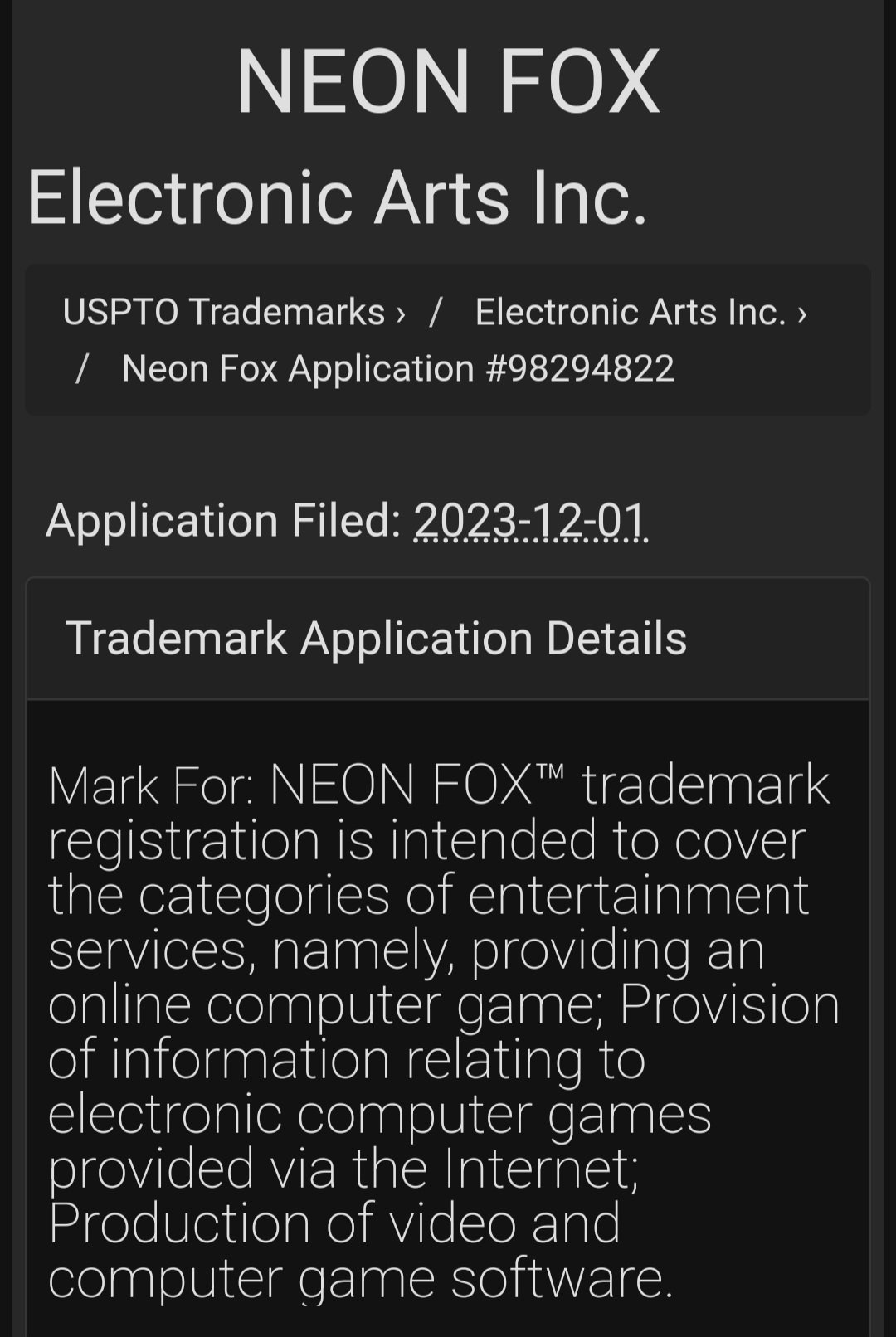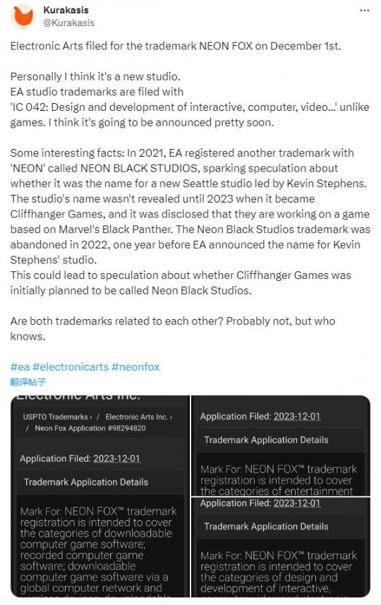 据职业爆料人“Kurakasis”近日在其官方推特上发布的内容来看,EA已经在12月1日注册了全新商标“Neon Fox”。 而从披露的文件来看,该商标注册包含交互式设计和开发、计算机及视频娱乐等方面,这意味着新商标“Neon Fox”可能是一款尚未公布的游戏,也有可能是新工作室的名称。 爆料者Kurakasis个人认为这是新工作室的可能性更高,因为EA在2021年“注册了另一个名为‘NEON BLACK STUDIOS’的商标,引发了人们对它是否是Kevin Stephens领导的西雅图新工作室的名字的猜测”。 不过到了2023年,NEON BLACK STUDIOS被正式更名为Cliffhanger Games工作室,而根据消息该工作室正在开发一款名为《漫威黑豹》游戏。 Kurakasis最后说:“这两个商标是相互关联的吗?也许不会,但谁知道呢。” |