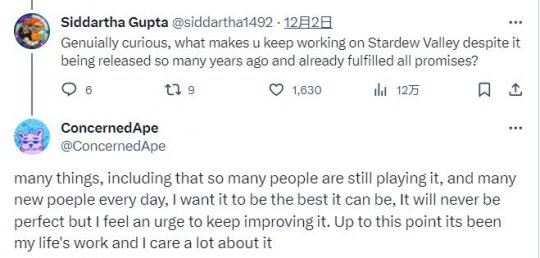 除此之外,ConcernedApe还解释了为何至今还在更新游戏,他表示现在仍然有很多人在玩《星露谷物语》,他希望能把游戏做到最好,这促使他产生了一种不断改进它的冲动,而到目前为止,《星露谷物语》已经成为了他一生的工作。
